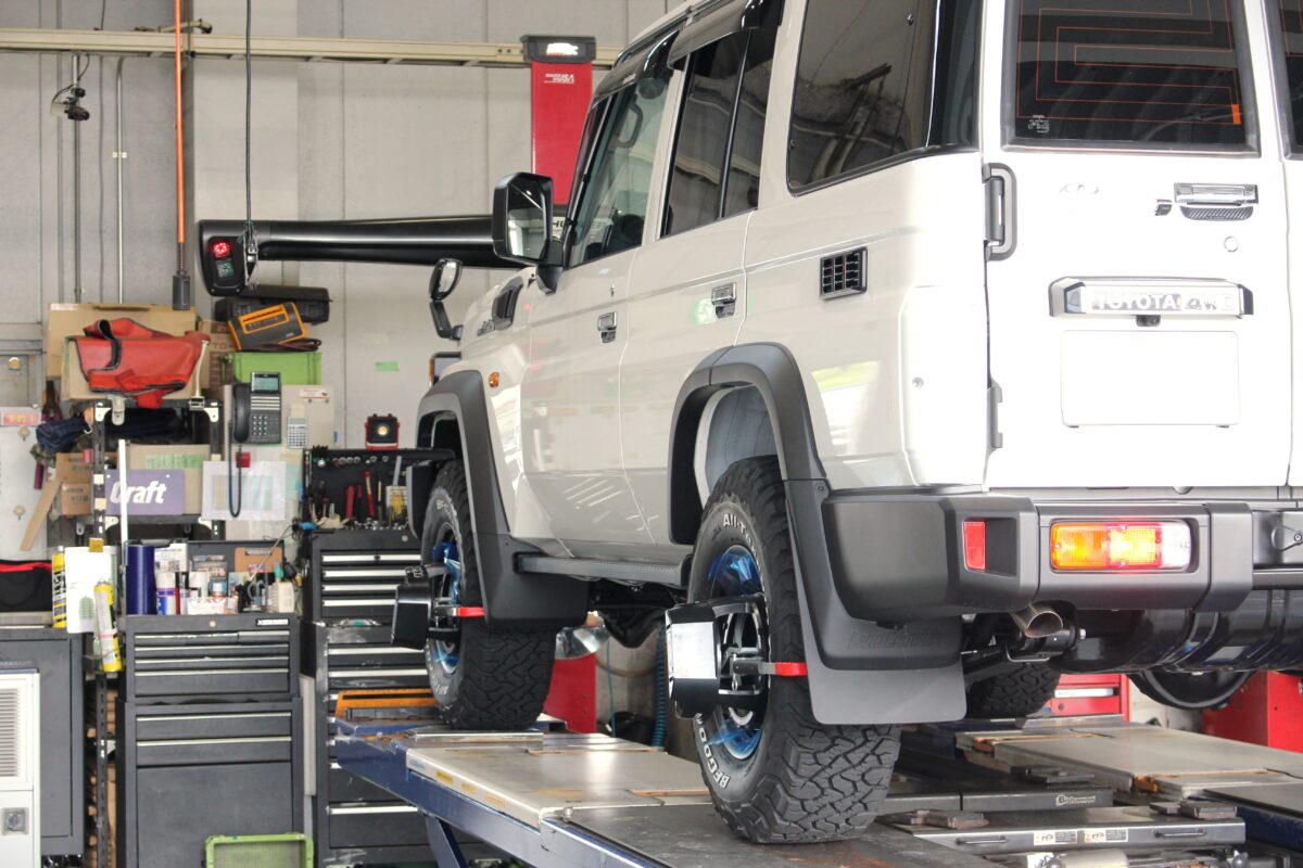 ランドクルーザー70は車高を上げるとハンドルセンターがズレやすい車両のため確認をします。