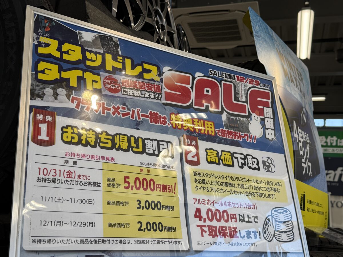 「スタッドレスタイヤセール開催中」なので、お得な特典もご用意!
