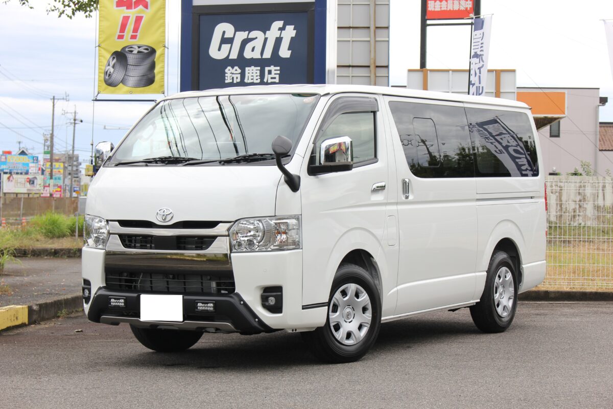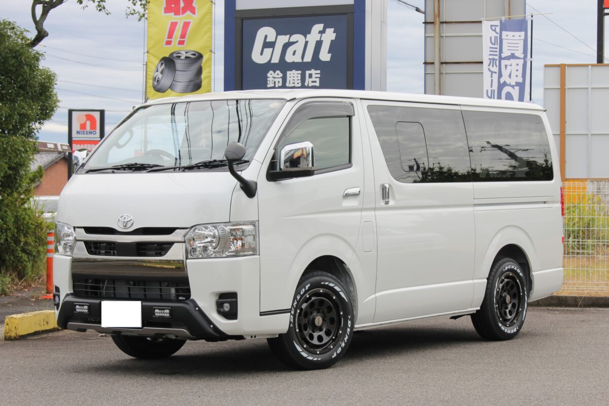 以前から度々申し上げておりますが・・・ハッキリ言って多いです! ハイエースのオフ系カスタムのご相談。 このスタイルなら4ナンバー規格でも耐荷重を満たしますし、 何かと使い勝手が良く、恰好もイイ。そりゃ流行るワケで。 こんにちは、アーバンオフクラフト鈴鹿店の小林です。 TRDエアロ、マッドフラップにノーマル鉄チンはナンセンス。 逆に違和感がありますね(笑) キーワードはインチアップ、ブロックパターンタイヤ、ホワイトレターです。 お選びいただいたホイールはRAYSデイトナM9。 プラドやジムニーに人気のデザインですが、 ハイエース用もご用意できますよ。 サイズは1インチアップの16インチ。 外径は据え置きでホワイトレターを履くのが最旬。 前後比べてみると「あぁ、なるほどな」ってくらいお似合いなんです。 Wheel:RAYS デイトナM9 6.5J-16in セミグロスブラック/リムDC Tire:TOYO オープンカントリーRT ホワイトレター ハイエースはインナーがタイトなので、外径をアップしなくても タイヤそのもののデザインで足元の迫力がかなり増します。 定番のナスカーを履く感覚でご用命いただく方が増えていますね。 車高はノーマル。 もともと腰高な車なのでこういったスタイルがしっくりきます。 ハイエースのこのサイズでライバルとなるのがジオランダーG015。 こちらも耐荷重を満たすホワイトレターですが、 スノーフレークマーク付きとあって万能なものの、パターンの迫力はRTの方が上。 さて皆さんはどっちがお好み!?一緒に悩みましょう(笑) マッドフラップとも相性良しですね。 ハイエースのオフスタイルはアーバンオフクラフト鈴鹿店にご相談ください。 ありがとうございました。