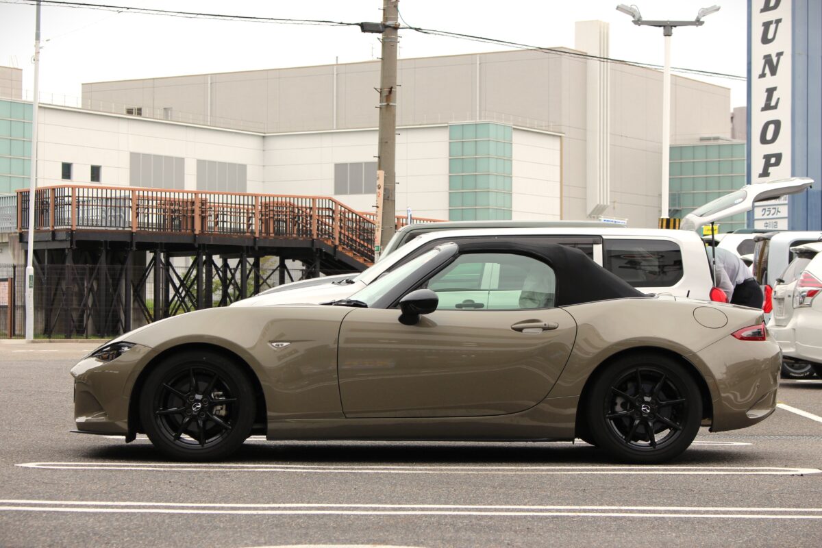 見慣れないボディーカラーのNDロードスター、特別仕様車"BROWN TOP"限定カラーの「ジルコンサンドメタリック」です。
