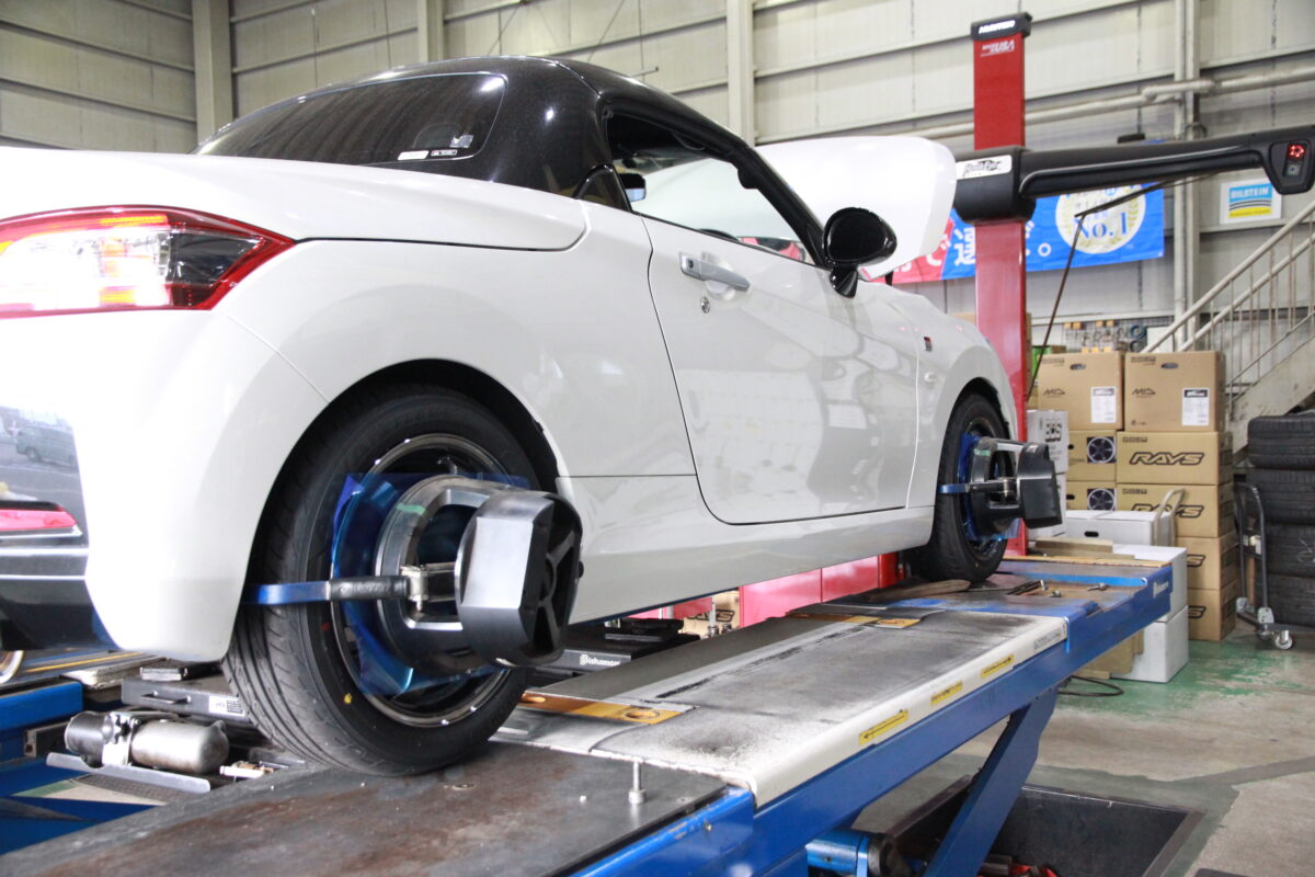 ホイールナットを取付、4輪アライメント調整へ。