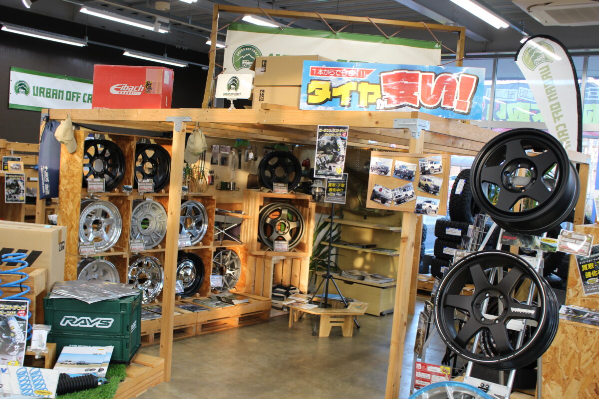 ■ ジムニー・シエラ・ノマド カスタムフェア開催中です! ジムニーカスタムフェア開催中のクラフト尾張旭店です。 ジムニー用ホイールを大量展示! デザイン・カラーをたくさん見て頂けます。 ジムニーカスタムはクラフト尾張旭店にご相談下さい。 人気ブランドホイール RAYS・4×4エンジニアリングのホイールを展示中。 鍛造モデルのAラップや、オフロードホイールと代名詞ブラッドレーもあります。 ウェッズ マッドヴァンスの新作も展示中です。 オフロードスタイルにピッタリなホイールですね! MID・PPX・デルタフォース・クリムソンなどなど 通常展示も豊富なクラフト尾張旭店です。 是非見に来てくださいね~ オフ系タイヤの在庫もありますので 即日取付可能な商品も多数あります。 ブラッドレー&カントリーサスペンションを装着したJB64デモカーを展示中です。 ホイール交換&リフトアップをするとこんなにかっこいいスタイルになりますよ! ジムニーカスタムフェアは3/8(日)までです。 たくさんのご来店お待ちしております。