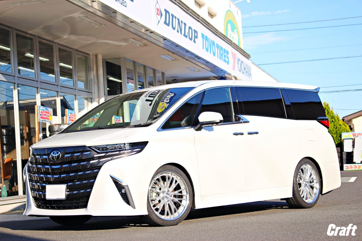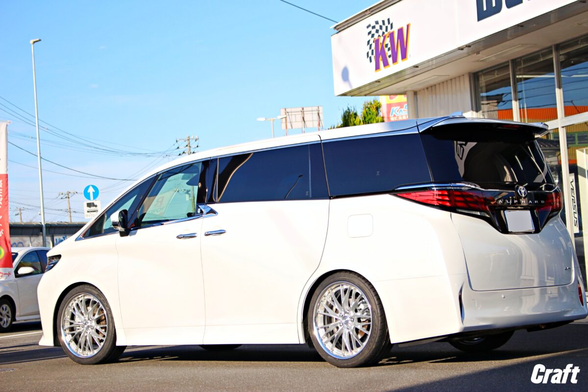 【30アルファード】WORKエモーションT5R 2P 20インチ装着!以前の仕様からサイズを算出、理想の出ツラ化を実現した本気カスタム。   アルファード/ヴェルファイアのご来店が多いクラフト一宮店です。 本日は、まだまだカスタム熱が冷めやらない大人気ミニバン、 30アルファードのご紹介です。   「今のホイールも気に入っているけど、もっと自分好みのツラにしたい!」 今回はそんなオーナー様の熱いリクエストにお応えすべく、 足元の仕様変更(リメイク)のお手伝いをさせていただきました。     選ばれたのは、スポーツとラグジュアリーを融合させたあの名作ホイール。 こだわりのセッティングで、見違えるような迫力ある姿へ進化します。   この度装着したのは、 スポーツカーに絶大な人気を誇る「エモーション」シリーズ。 その中でも、力強い5本スポークデザインが特徴の 「T5R」の2ピースホイールモデルです。     あえてこのスポーツテイスト溢れるホイールを、 重量級ミニバンの30アルファードに合わせるのが、 最高にクールなんですよね。   カラーはWORK特有の深みがある「GTS(グリミットシルバー)」。 光の当たり方で陰影がくっきりと浮かび上がり、 アルファードの高級感あるボディに負けない、上品かつ力強い輝きを放ちます。     そして、今回のカスタムの最大のハイライトが「サイズ選び」です。 2ピースホイール最大のメリットは、 インセットをミリ単位でオーダーできること。 今回は、以前の仕様からサイズを算出、 理想の出ツラ化を図るべく、オーナー様と綿密な打ち合わせを行いました。   「前のホイールはこれくらいだったから、次はあと〇ミリ外に出して、リムも深く取りたい」 そんな理想を形にするため、現車でのセッティング状態をベースに限界サイズを計算。 フェンダーギリギリを攻めつつ、 美しく収まる究極のツライチマッチングを導き出しました。 この「自分だけのサイズを作る」過程こそが、 カスタムの醍醐味ですよね。     迫力の20インチを支えるタイヤ選びも妥協しません。 組み合わせたのは、 ヨコハマタイヤのフラッグシップ・ミニバン用タイヤ「ブルーアースRV03」。   重量のある30アルファードでも、 ふらつきをしっかり抑え、静粛性や乗り心地も抜群。 見た目のカッコよさだけでなく、 同乗者を乗せてのドライブも快適にこなせる、 まさに「死角なし」の組み合わせです。     いかがでしょうか!この圧倒的な存在感。 30アルファードの重厚なボディに、 WORK エモーションT5R 2Pのスポーティな 5本スポークが見事にハマっています。 オプションのセンターキャップも追加で入れていますが、 この相性も合わさり更に仕上がっています。     以前の仕様からサイズを算出、 理想の出ツラ化に成功したフェンダーとのクリアランスは、 思わずため息が出るほどの美しさ。 GTSカラーの艶やかな輝きと、 2ピースホイールならではの段リム(ステップリム)が、 足元に圧倒的な立体感を生み出していますね。   この度はご用命いただき、誠にありがとうございました。 30アルファード × WORK エモーションT5R 2P。 見た目の迫力も、走りへのこだわりも、 すべてがアップデートされた最高の一台に仕上がりました。     当店では、ホイールの仕様変更や、 「今の状態からもっとツラを攻めたい」といったご相談も大歓迎です。 豊富なデータと実測で、お客様の理想のスタイルを形にします。   それではまた次回のブログもお楽しみに。 クラフト一宮店でした。   管理番号:0042603081003