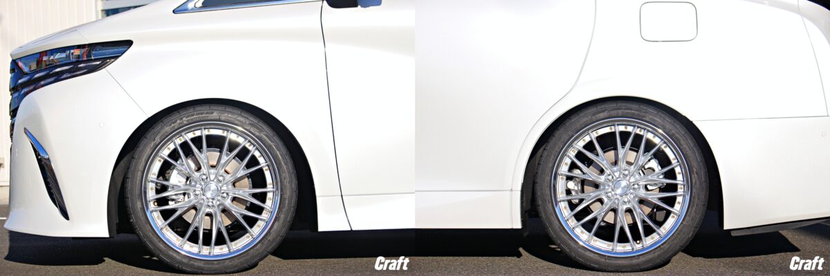 シャコタン・ツライチもお任せアレ!! 【 WORK×パーフェクトダンパー 】で仕上げたツラ・ヴェルをご覧あれ~✨     いつもありがとうございます、クラフト厚木店・佐藤です!!   本日のご紹介はN様・40ヴェルファイア。   N様からいただいたミッションは 「 ツラ・ヴェル 」 作り。   ツラ・ヴェルとは 「 ツライチ・ヴェルファイア 」 の略。笑   実際にはそんな言葉はありませんが、カッコ良いヴェルファイアが完成しましたよぉ~✨     ご購入いただいたホイールは 「 WORK シュヴァート・グラソン 」 22インチ。   カラーはブリリアントシルバーブラックをチョイス。   今回装着したホイールの拘りポイントは22インチと言う 大口径サイズ にありますっ✨     どうでしょうか、このキレイに並んだフィンタイプのスポーク。   シュヴァート・グラソンの22インチはステップリム形状を採用。   そして選べるカラーは2色設定されており、本日装着のブリリアントシルバーブラック、そして明るい色味のシルキーリッチシルバーが設定されています。   その通常カラーにプラスしてリムカラー変更やオプションカラーを使ったカラーコーディネートも可能 👍     そしてローダウンアイテムとして選んでいただいたアイテムは 「 パーフェクトダンパー 」 ですっ✨   コチラの車高調は皆様も知っての通り、車高調らしからぬ柔らかさ(良い意味で)がウリのアイテム。   ファミリーカーなので乗り味を悪くせずにローダウンしたい。。。   そんな悩みを抱えているオーナー様も多いかと思いますが、そんな皆様にはオススメのアイテムですよぉ~♬♬   それでは、ノーマル時、そしてカスタム後のヴェルファイアを比較してみましょう!!     車高もバッチリきまり、カスタムCarらしいオーラを放っていますよねっ 👍   この画像では出ヅラは分かりにくいと思いますが、そんな画像もしっかりご用意してありますのでご安心を✋     ところで、皆様は出ヅラの調整はどのように行うのが良いと思いますか!?   ちょっと難しいご質問となってしまったかも知れませんが、出ヅラの調整で良く使われるのが 「 スペーサー 」 ですよね 👀   ですが、スペーサーはナットの掛かりが少なくなってしまうので、出来れば使わないにこした事はありません。   それではホイールの出ヅラの調整は何で行うのが良いのでしょうか??     その答えは 「 ホイール側で調整する 」 のがベスト!!   ホイール側で調整すると言ってもちょっと分かりにくいでしょうかね。。。   ホイールにはリム幅(J数)やインセット(+〇〇)と言うのがありますよね!?   その数値を調整してあげる事でスペーサーを使わずにオーナー様お望みの出ヅラへと仕上げる事が出来るんです 👍     そこでオススメなのが本日装着しいているような 2ピースホイール となります!!   2ピースホイールの良い点、それは出ヅラを決める 「 インセット 」 を1mm単位で自由にオーダー出来るところにありますっ👍   なので、当店得意の 実車計測 を交えてサイズを計算してあげると。。。👀     この様に、キレイな 「 ツライチ仕様 」 を実現する事が出来ますっ 👍   本日ご紹介の40ヴェルファイアもスペーサーは使っておりません。   それでもこの仕上がり!!   この仕上がりをご覧いただいたオーナー様からは 「 任せて良かった。。 」 っと嬉しいお言葉を頂戴しました。   皆様の愛車も当店得意の 実車計測 を行い、カッコ良く仕上げてみませんか??   それでは、皆様からの沢山のご相談お待ちしておりま~す✨     N様、今回の愛車でもカスタムをお任せいただき誠にありがとうござます!!   車高と言い、ホイールの出ヅラと言い、理想の ツラ・ヴェル  に仕上がりましたよねっ✨   セッティング後の調子はいかがでしょうか!?   車高の高さなどご不便となる場合はいつでもご相談下さいね!!   それではまたのご利用お待ちしておりま~す☆☆     管理番号:0412602221003
