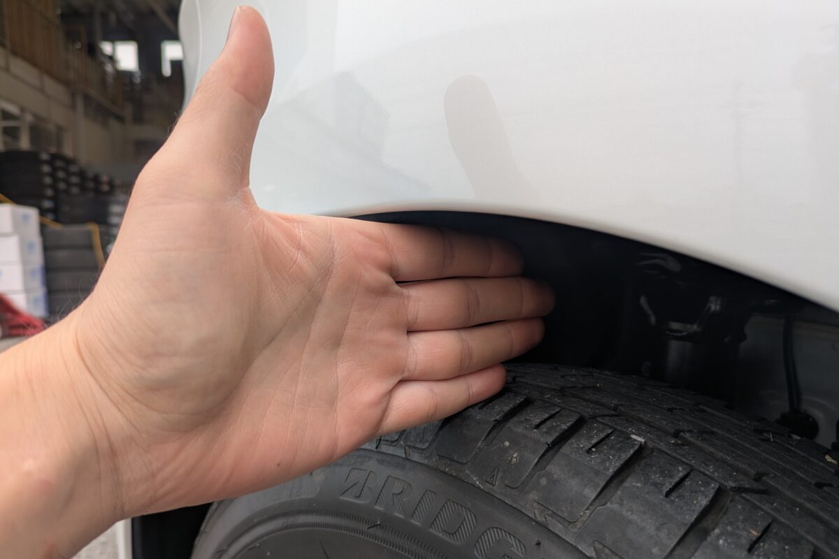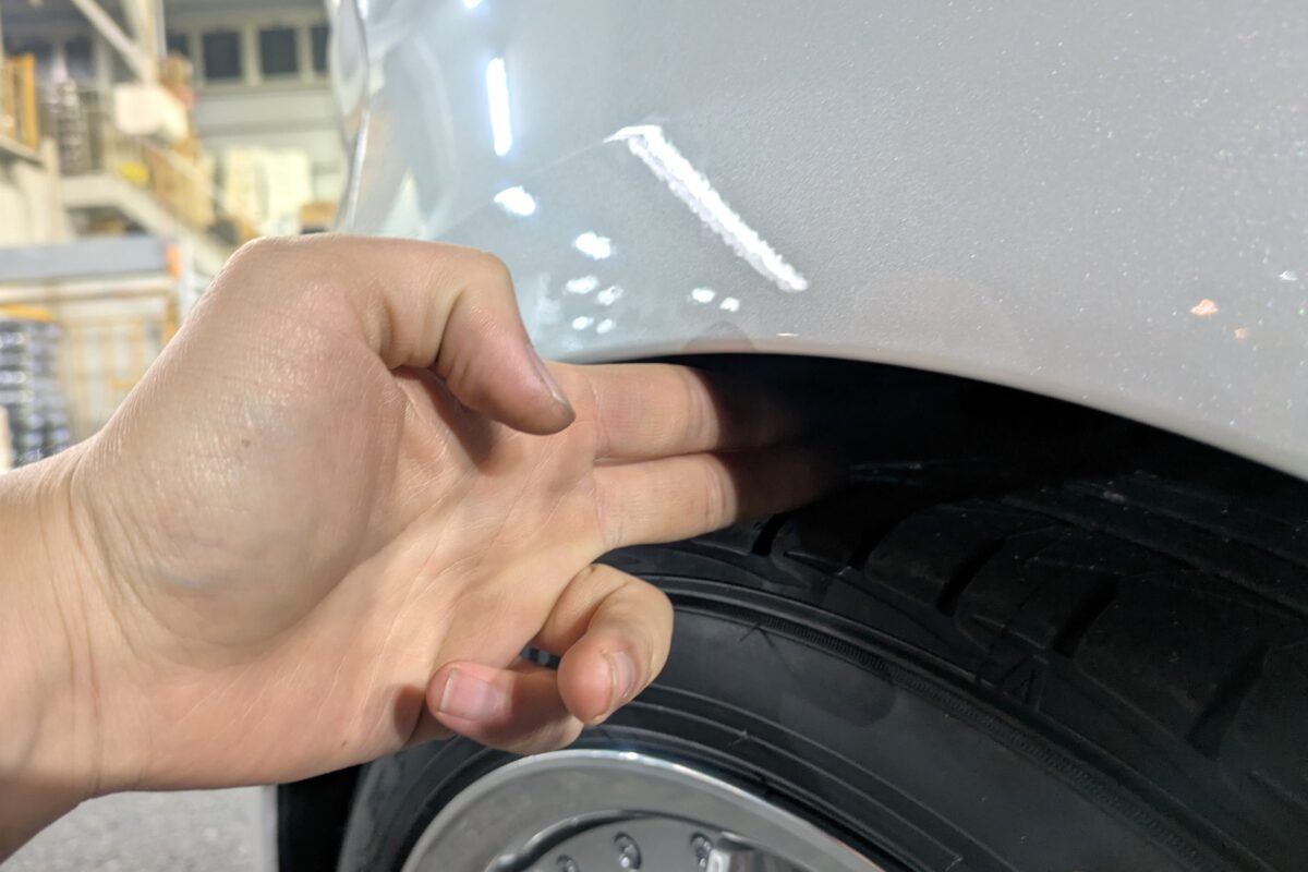 純正状態は指4本ぐらいのフロントフェンダークリアランスでした。