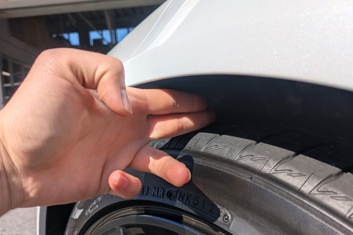 純正状態のフロントフェンダークリアランスは指2本に少し余裕があります。