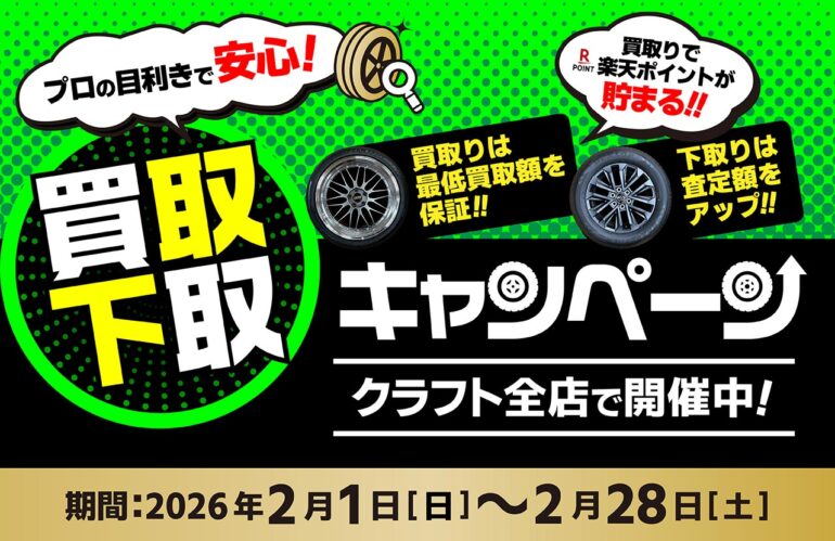 ■【期間限定!】お得に新しいホイールを手に入れるなら今がオススメ!買取&下取りキャンペーンを開催!! 皆さんこんにちは、クラフト中川店の加藤です。 突然ですが、ご自宅のベランダやガレージに眠っているホイールはございませんか? 「新しいデザインに替えたいけど、今のホイールの処分に困っている…」 「どうせ売るなら、少しでも高く買い取ってほしい!」 そんなお客様の声にお応えし、2月1日から2月28日までの期間限定で、「ホイール買取&下取りキャンペーン」を開催いたします! このキャンペーン期間中に限り、お客様がお持ちのホイールの買取または下取り価格が通常よりも好条件にてご提示いたします。 ・特典1:買取りの場合は最低買取額を保証いたします! アルミホイールであればどんなものでも買い取りできます。思わぬ高額査定がつく場合も…!? ・特典2:下取りの場合は査定額をアップ! 当店で新しいホイールをご購入いただく際の下取りとしてお出しいただくと通常よりも査定額をアップしてご提示、新しいホイールへの交換が断然お得になりますよ! 古い・傷ありでもOK! 「もう古くて売れないかも…」「少しガリ傷があるけど大丈夫?」といったホイールでも大丈夫です! 人気のブランドホイールや、高年式の純正ホイールは特に高価買取いたします。査定だけでも大歓迎です! 専門スタッフが丁寧に査定いたしますのでまずはお気軽にご相談ください。 さらにクラフトなら全店で「アルミホイールの買取りで追加で楽天ポイントが貯まります」 【1】店頭で商品(タイヤ・ホイール)を査定 【2】買取成立!現金ゲット!! 【3】楽天ポイントカードを提示 【4】さらにポイントも貯まる! 買取額200円(税込)あたり楽天ポイント1ポイントをゲットできます! ※買取りでの楽天ポイント付与はキャンペーン期間中に限らず常時行っております。 お得な特典が盛りだくさんのこの機会に、ご自宅に眠っているホイールがございましたら是非当店へお持ち込みください。 皆様のご来店をスタッフ一同お待ちしております。 ~次回開催~