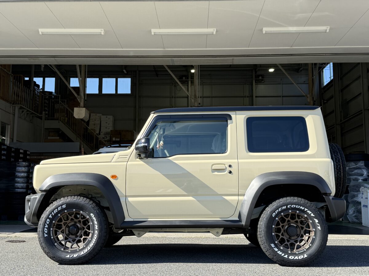 タイヤ外径を少し大きくした「215/70R16」をサイズ選定したことで、フェンダーの隙間も埋まり、本来のイメージである「ジムニーシエラ」に相応しい圧倒的な存在感とM8のメッシュデザインが都会的で洗練されたオーナー様お好みへと変貌しました。