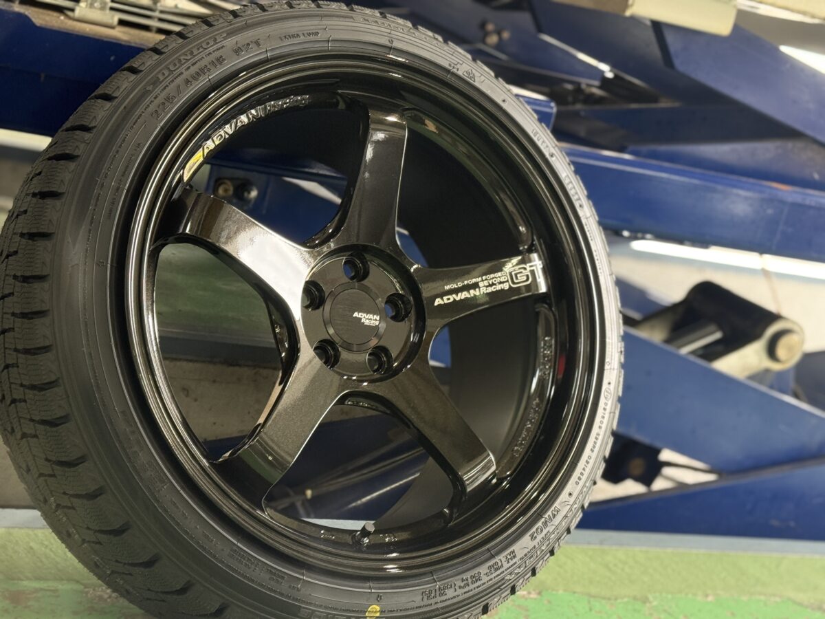 なんと、この最高級鍛造ホイールに「スタッドレスタイヤ」を組み合わせるという、超ド級の装着となりました。