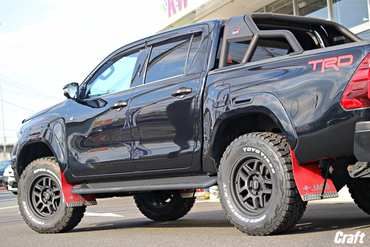 まず、ハイラックスはタイヤサイズを大きくするとすぐに干渉問題が発生するおクルマ。