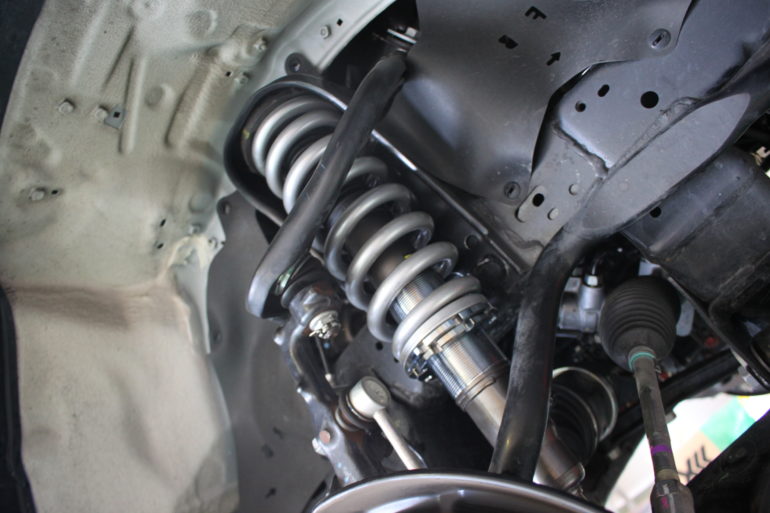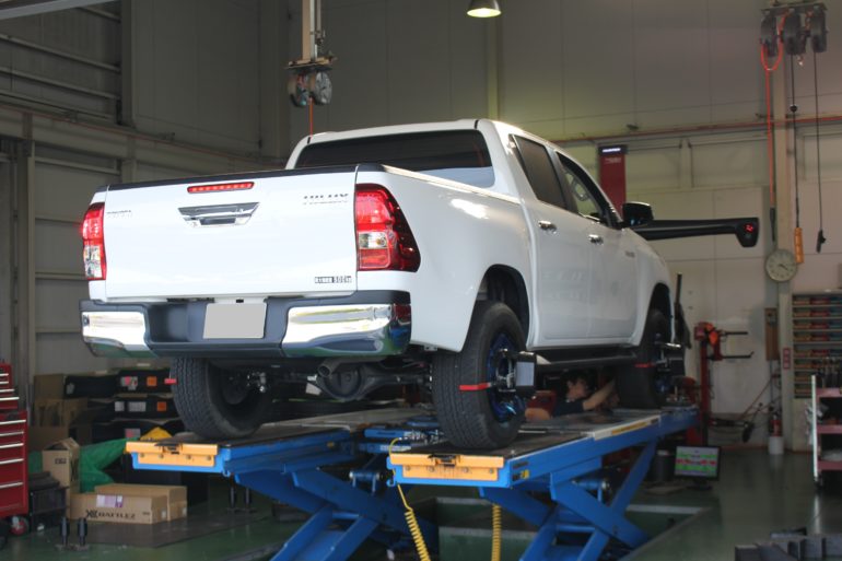 フロントとリアとの水平バランスを見ながら車高調整作業に入ります。