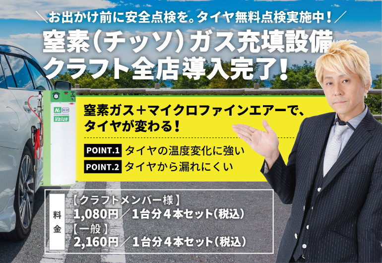 窒素の充填は1台分で2160円(税込)、クラフトメンバー様は1台分で1080円(税込み)で充填可能。