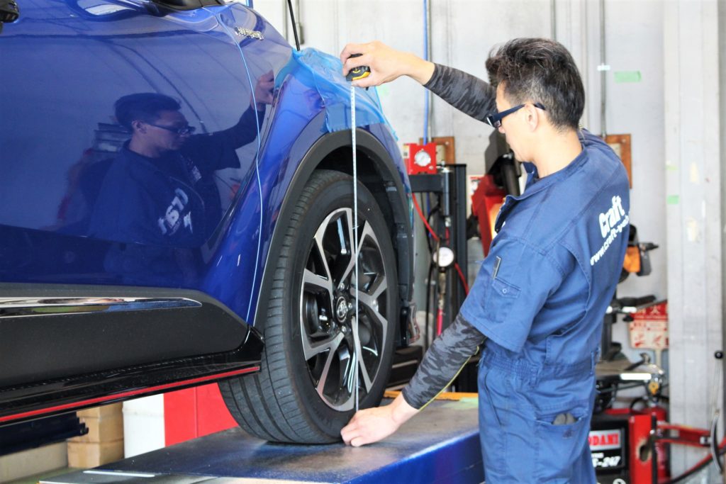 ご入庫時にノーマル車高を前後左右確認し、作業スタート!
