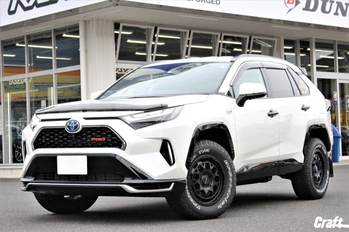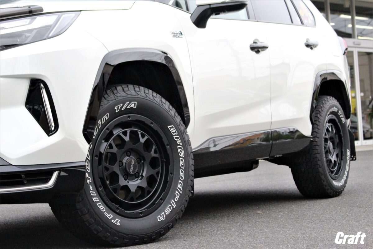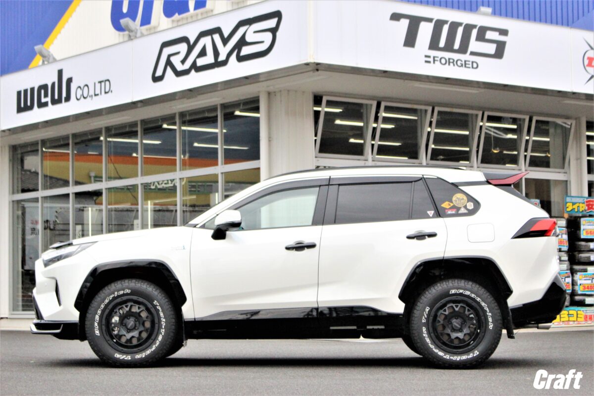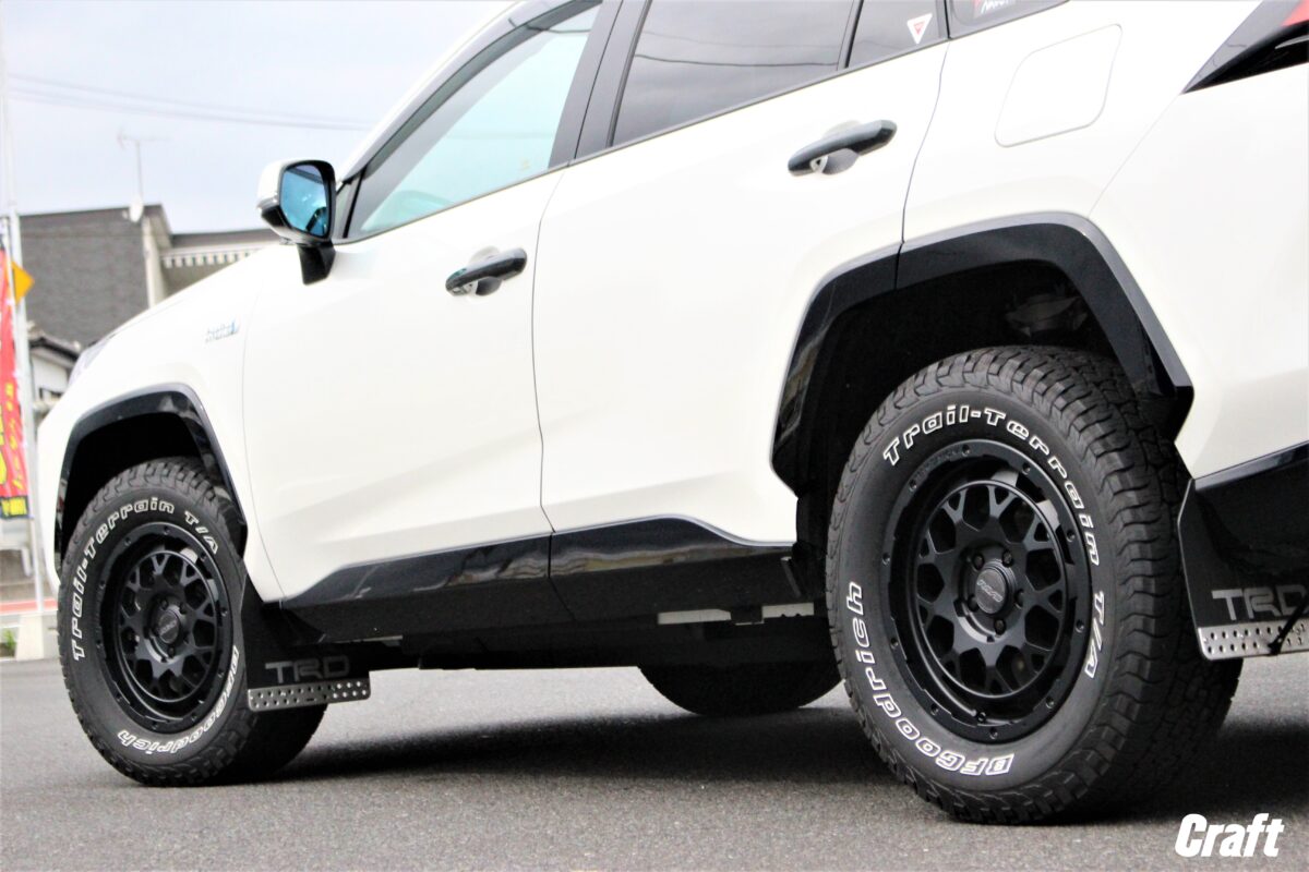 RAV4のアーバンオフ仕様。 リフトアップコイルにマッドガード、さらにはホイールもJAOS製で~す✨     いつもありがとうございます、クラフト厚木店・佐藤です!!   本日のご紹介はU様・RAV4となりま~す♬♬   リフトアップにホイールとバランスを考慮しJAOSで揃えましたよぉ~ 👀   それではコチラをどうぞ。     まずはリフトアップアイテム。   ■ JAOS BATTLEZ リフトアップコイル Ti-W   RAV4の定番リフトアップアイテム タナベUP210 も候補にあがっておりましたが、どうせなら全部JAOSにしちゃいませんか??って流れでJAOSをチョイス!!   リフトアップ量は 「 フロント:30mm リア:20mm 」 となっております 👀     お次は横からの画像です。   RAV4アドベンチャーの車高バランスを考えたリフトアップ量となっておりますのでこの様にバランス良く仕上がってくれます 👍   タイヤとフェンダーのクリアランスが前後同じ位に見えますかね 👀   RAV4のボディーラインはやや前傾姿勢で作られているのでリアのリフトアップ量を控えめにしてあげるのもアリですよね!!     ホイールは 「 JAOS ADAMAS BL5 16インチ 」 をチョイス!!   コチラのアイテムは16インチと17インチが設定されていますが、タイヤの厚みを確保するため16インチを選択しています。   カラーはマットブラック、ホイールが落ち着いた色味であるからこそホワイトレターがより際立ちますよねっ 👍   タイヤは トーヨータイヤ オープンカントリーRT 235/70-16 を組み合わせています。   オープンカントリーRT、RTってなんだろ。。。 👀   そんな疑問を持つ方もきっといらっしゃいますよね!?     良く聞く呼び名だと 「 オールテレーン 」 とか 「 マッドテレーン 」 が有名かと思います。   RTとは ラギットテレーン の略で、オールテレーンとマッドテレーンの間に位置するモデル!!   オールテレーンより凹凸の大きいトレッドパターンとなっていますがマッドテレーン程快適性は失われません。   個人的な感覚をお伝えすると、乗り味(振動やノイズ)はオールテレーンタイヤとそれ程変わらない印象。   更には 「 TOYO TIRES  OPEN COUNTRY R/T 」 の白い文字がカッコ良いですよねっ👍   サイズラインアップも幅広いので様々なおクルマへ装着出来ますよぉ~♬♬   貴方の愛車にも オープンカントリーRT を履かせてみませんか?? 👀   それでは皆様からのご相談お待ちしておりま~す✨     U様、この度はご利用誠にありがとうございました!!   もともと車輛に装備されていたJAOSパーツも多かったので今回のカスタムをJAOSで統一したのは正解でしたよねっ 👍   リフトアップ後の愛車はいかがでしょうか!? 👀   そして次なるカスタムは??笑   それではまたのご利用よろしくお願いしま~す☆☆