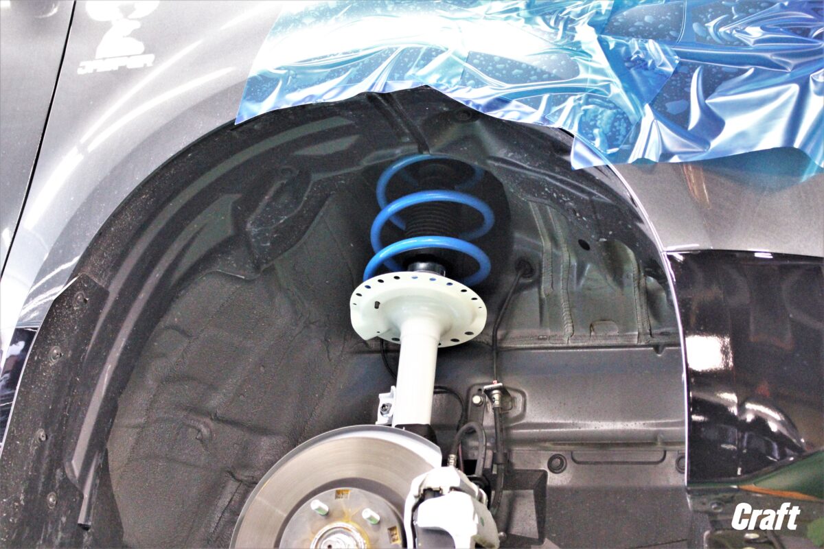 リフトアップアイテムをクルマへ装着し、タイヤ・ホイールを装着。