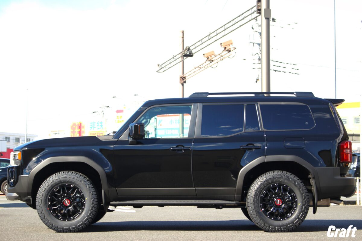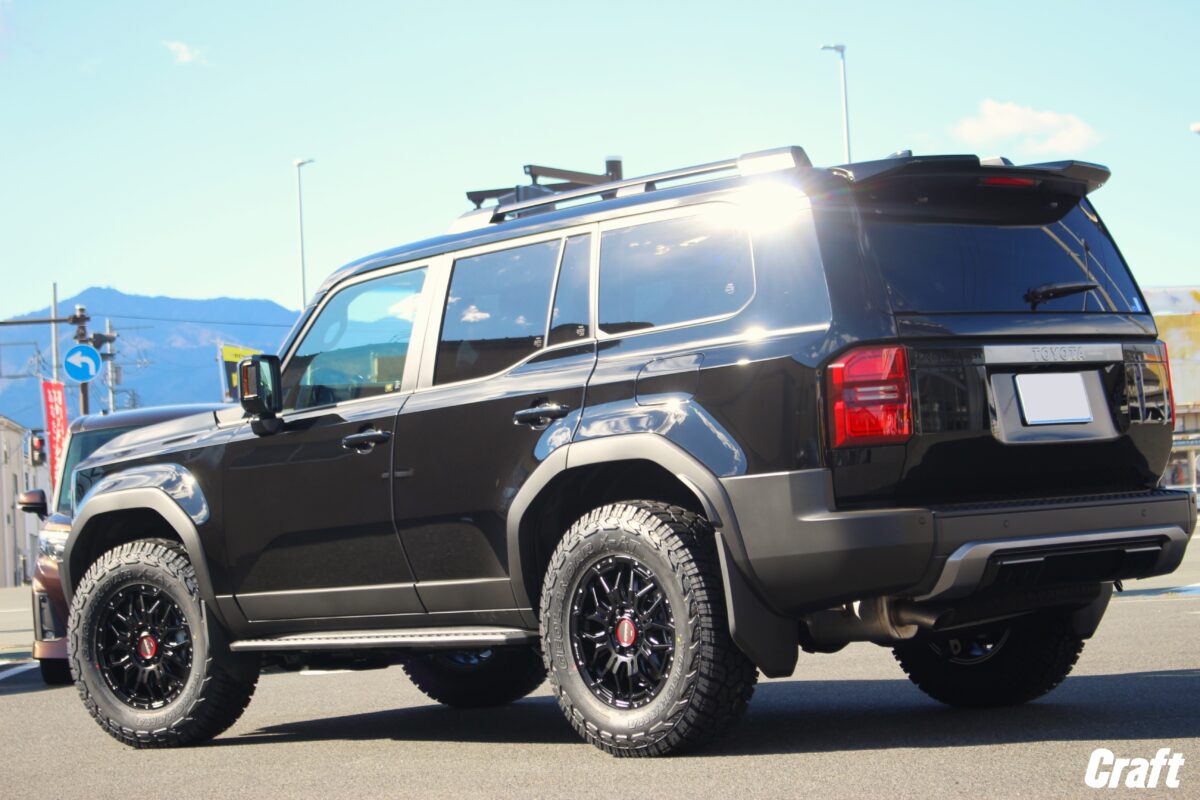 ワイドフェンダーが必要となる場合もありますが。。。 こんな肉厚仕様はいかがでしょうか??     いつもありがとうございます、クラフト厚木店・佐藤です!!   本日のご紹介はI様・ランドクルーザー250。   17インチへのインチダウン、そしてスプリングを交換しリフトアップを行いましたよぉ~✨   それではコチラをどうぞ!!     ご購入いただいたホイールは 「 RAYS A・LAP-07X 17インチ 」 となります!!   ランクル250向けのアイテムでは数少ない希少な17インチ仕様のホイールです。   しかしながら、設定されているインセットが+40台となっているので ” チューナーサイズ ” と呼ばれるサイズ感となります。   チューナーサイズとはどう言う意味なのか!? ってところをご説明しますね。     見ての通り、キレイに履く事が出来る訳ですが、一緒に組合わせるタイヤサイズによってはオーバーフェンダーが必要となるサイズ感でもあるんです!!   そんなタイヤサイズですが 「 265/70-17 」 を組合わせる場合はノーマルフェンダーのままでも良いかも知れません。   しかしながら、275サイズや285サイズを装着する場合はワイドフェンダーの装着も視野に入れた方が良いかも知れません。。。     そして、インチダウンの肉厚仕様を完成させるには 「 リフトアップ 」 はマストなアイテムではないでしょうか!?   そんな訳で本日はタナベさんからリリースされているリフトアップサス ” DEVIDE UP210 ” を同時に装着しましたよぉ~✨   リフトアップ量は 「 フロント:1,5インチ リア:1,0インチ 」 程と、ナチュラルなリフトアップを実現出来るアイテムとなっています 👍   そうは言ったものの、その効果はなかなかのものですよ。。。👀     ノーマル・カスタム後と画像を並べてみましたがいかがでしょうか!?   フェンダーの奥に見える赤いスプリングがイィですよねっ♬♬   更にはインチダウンを行った事でタイヤが肉厚となり足元に迫力が加わりましたよねっ✨   イメージ的には 「 いかにもオフロードを走ります。。」 って感じのスタイルでしょうか 👀   実際にはオフロードを走っても・走らなくてもこう言う仕様に仕上げるのはアリですよ 笑 ✋     ご入庫時のノーマル250とカスタム後の250とでは全く別のクルマに見えませんか??   これが 「 ドレスアップ 」 の効果と言う訳です 👍   もちろん、ここまでカッコ良く仕上げるにはそれなりの費用は掛かってしまいます。   ですが、それ以上に愛車がカッコ良く仕上がる満足感が勝ると思いますよぉ~笑     本日装着しているタイヤサイズは 「 285/70-17 」 となかなか大きなタイヤサイズとなります。   この位のタイヤサイズを履かせる場合にはワイドフェンダーを装着する事をオススメします!!   ちなみに、オーナーのI様はワイドフェンダーを装着する事を前提にコチラの組み合わせをチョイスした形となります 👍   ホイールサイズやタイヤサイズ、そしてワイドフェンダーの有無により車輛への装着が出来ないアイテムも出てくる事もあります。   詳しくは店頭にてスタッフまでご相談下さいね~ 👀   それでは皆様からの沢山のご相談お待ちしておりま~す✨   ■ RAYSホイールも対象の冬のクラフトカスタムフェア開催中!!リフトアップアイテムを同時に成約いただく事で更にお得になりますよぉ~✨     I様、この度はご利用誠にありがとうございました!!   ご入庫時はどこにでもいる普通のランクル250でしたが、施工後はなかなか目を惹くランクル250に変身しましたよねっ✨   カッコ良く仕上がった愛車でのドライブはいかがでしょうか??   もし良かったらオフロード走行も楽しんでみて下さいね~♬♬   それではまたのご利用よろしくお願いしま~す☆☆     管理番号:0412511211009