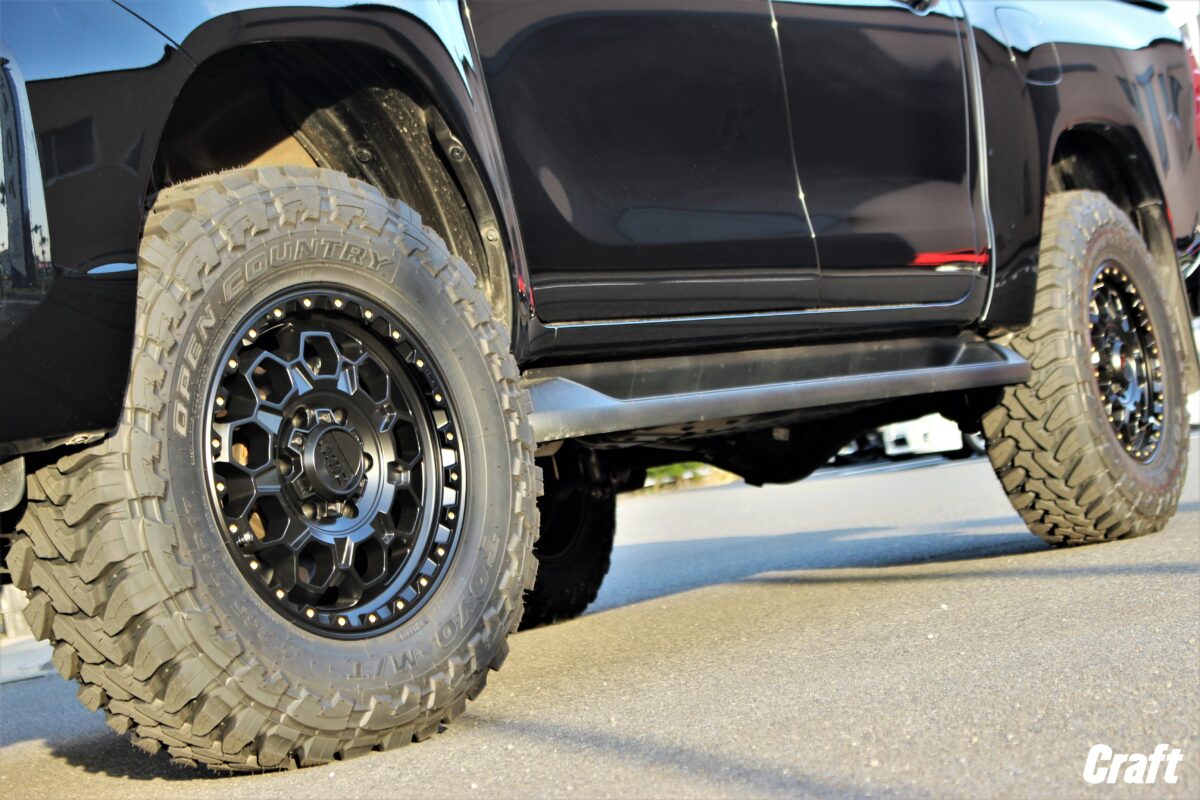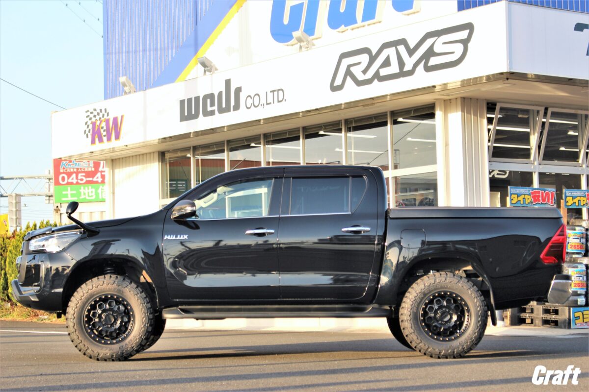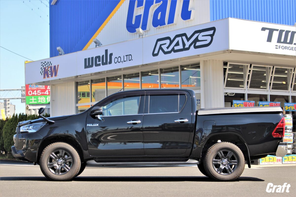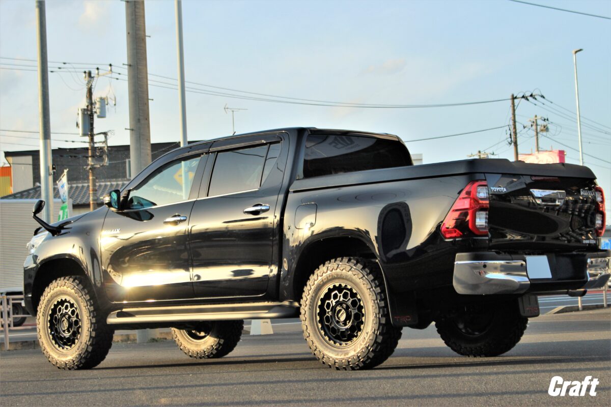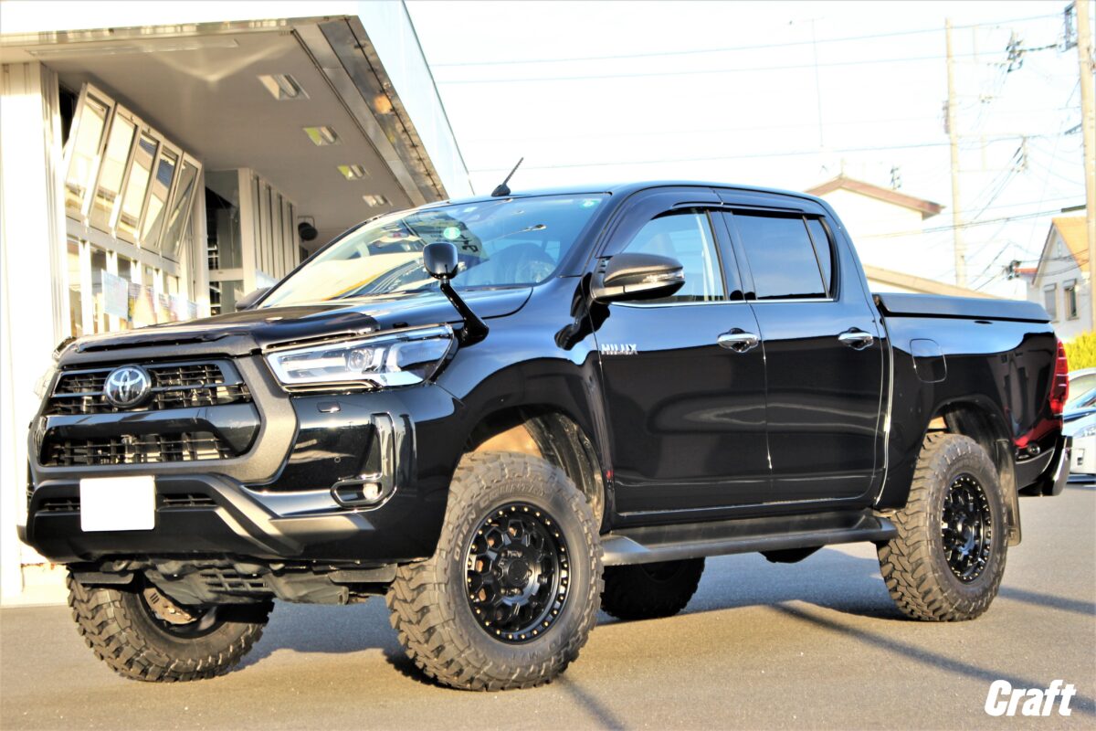 ハイラックスは 「 265/70R17 」 でも干渉するクルマ。。。 今回はJAOSマッドガードとの関係性も考慮しながら仕上げましたよぉ~✨     いつもありがとうございます、クラフト厚木店・佐藤です!!   本日のご紹介は、千葉県からお越しのT様・ハイラックスGRスポーツ。   ハイラックスと言えば、当店でもご相談が多く、今までにも多くの施工を行って参りました。   今回はその経験から得たノウハウで、オーナー様のご希望をしっかり叶える事が出来ましたよぉ~✨   それではコチラをどうぞ!!     T様からのご依頼は 「 タイヤ・ホイール交換 」 & 「 前下がりの補正(リフトアップ) 」 となります。   装着したリフトアップアイテムは 「 JAOS BATTLEZ リフトアップセット VFCA Ver.A 」 となり、車高の調整機能が備わっているモデルをチョイス。   今回オーナー様からいただいたご希望をクリアするには、この 車高調整式 と言う機能が必要だった訳です!!     上の画像はご入庫時のノーマル車高になります。   いたって普通のHILUX GR SPORTでしょうかね 👀👀   言ってしまえば、HILUX特有の前下がり感が見て取れます。。。   そして、ブレーキキャリパーとカラーを揃えたマットガードも装着しています。   今回はこの 「 マッドガードを装着している 」 と言う点に注意を払い、アイテム選びやセッティングを行いました🔧🔧     続いての画像は完成後のハイラックス。   見ての通り、車高が補正され、前下がり感もなくなっていますよねっ✨   前下がりの補正だけを考えた場合、同じくJAOSさんからリリースされているリフトアップコイルでもOK。   ですが、今回はタイヤサイズアップとそれに伴うマッドガードへの干渉も考え VFCA Ver.A を装着したんですよね。。。     まず、ハイラックスはタイヤサイズを大きくするとすぐに干渉問題が発生するおクルマ。   なので、どの位のリフトアップ量に仕上げるのかがとても重要!!   GRスポーツの場合、純正タイヤサイズが 265/60R18 となりますが、265/65R18 や 265/70R17 と言ったワンサイズアップ程度でも干渉問題がつきまとうんですよね。。。   しかも、ノーマル車高ではなく、リフトアップを行っていたとしてもです。汗     リフトアップを行っていないならともかく、リフトアップを行っているのに 「 ワンサイズアップ 」 も出来ないなんて、何だか残念ですよね。。。   ちなみに、干渉問題が発生するのは 「 フロント 」 のみとなり、更にはハンドルを切った時に限定されます。   そんなおクルマだからこそ、JAOSさんからインナーフェンダー加工KITが商品化されているんでしょうね 👀   それでは、HILUXはタイヤサイズを大きく出来ないのか??ってところですよね。   答えは 「 NO 」 です!!     当店でも 「 265/70R17 」 と言う定番サイズを筆頭に 「 275/70R17 」 や 「 285/70R17 」 などの2~3サイズアップまでのサイズはご要望も多く、多くの装着事例があります 👍   ですが、今回はJAOSマッドガードを装着しており、その部分の干渉を避けたいと言うご要望を加味しながらアイテムをチョイス!!   まずリフトアップアイテムに VFCA Ver.A をチョイスしたのは干渉を防ぐために 2.5インチ 程のリフトアップを行う必要があった為。   ちなみに、この仕様(リフトアップ量)の事を当店では 「 ちょいアゲ仕様 」 と呼んでいます。笑   ちょいアゲと言っても少し上がる訳ではなく、迫力の仕上がりとなりますよぉ~✨   そしてハンドルを切った際の干渉を抑える為に 「 265/70R17 」 と言うタイヤサイズをチョイス👍   この組み合わせにより、施工後もタイヤとマッドガードの干渉を抑える事も出来、オーナー様のご希望を叶える事に成功したと言う訳です。   そしてもう1つの拘りが出ヅラになります👀👀     上の画像のように、しっかりリフトアップを行った事で、タイヤサイズを大きくしながらもマッドガードへの干渉は回避。   そして最終ミッションはハイラックスGRスポーツのワイドフェンダーにマッチするホイールサイズの提案です!!   本日装着の RAYS DAYTONA D325 は見ての通り、オフ感漂うアイテム。   ですが、その良い雰囲気も出ヅラ次第では良さを引き出しきれないんですよね。。。   そんな訳でホイールサイズにも拘って仕上げた出ヅラがコチラ!!     前後ともに、キレイな出ヅラへと仕上がっていますよね!?   タイヤのサイドウォール部でギリギリの出ヅラ、これぞツライチと言った仕上がりっ 👍   特にHILUXは1ナンバー(普通貨物)の登録の為、プラドやランクル250などの普通乗用車とは基準が違います。   要は 「 タイヤ(ゴム部)の突出も許されない 」 クルマなんですよね。。。汗   そんな事から、今回のカスタムはリフトアップ量の計算や干渉を抑える為のタイヤサイズ、更には出ヅラと言った多くの計算が必要となるカスタム事案だった訳です。   そんなちょっと高度なミッションでしたが、当店で行ってきた多くの施工事例から得たノウハウで無事施工完了っ👍   これから愛