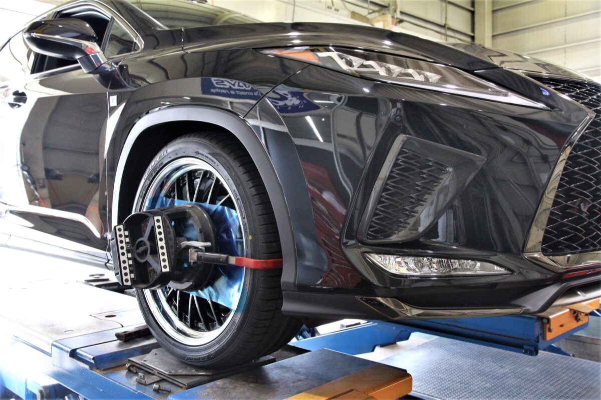 サスペンション装着後はお約束のアライメントもしっかり施工。