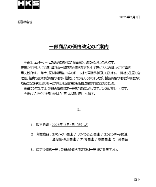 人気のチューニングパーツメーカーのHKSが3月4日(火)受注分より値上げを発表