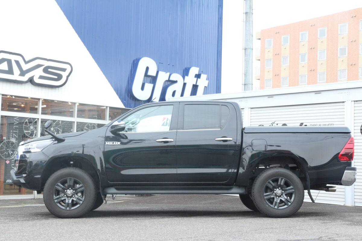 2.0インチアップで普通に見える。。。ちょいアゲ仕様でようやく大きく見える!! ハイラックスGRスポーツのカスタムはクラフト厚木店にお任せ下さいっ✨     いつもありがとうございます、クラフト厚木店・佐藤です!!   本日は 「 ハイラックスGRスポーツ 」 のカスタムをご紹介しますねっ✨   ハイラックスのカスタムを検討中の皆様、リフトアップ量はどの位を考えていますか?? 👀   上の画像を見ていただいても分かりますが、バランス良く仕上がっていますよね!?   当店で行うリフトアップは主に ドレスアップ を目的としたリフトアップが多いかも知れません。   っと言うのも、オーナー様にリフトアップの目的を伺うと、ほとんどのオーナー様が ” ドレスアップを目的としている ” とお答えいただくからです。     この様に、ゴツゴツとしたタイヤを装着し 「 いかにもオフロードを走りますっ 👍 」 って感じの見た目に仕上げる事が目的と言う訳ですよね!!   でも、カッコ良く仕上がった愛車に乗るのってとっても楽しいですし、テンションも⤴ ⤴ ますのでオフロードを走る事が目的でなくても良い訳です。笑   逆に、オフロードを走る事が目的であったり、本場アメリカで走ってそうなもの凄いリフトアップ量に仕上げるのもアリだと思います!!   ですが、ココは日本。   アメリカとは違い車検と言う物がありますので、やり過ぎるとその後の手続きが色々と面倒になる事も。。。   そんな意味では本日施工したハイラックスGRスポーツは良い手本になるのではないでしょうか!?     GUN125系のハイラックスは前期も後期も、そしてGRスポーツと、どのモデルも前下がりに見えてしまうおクルマですよね!?   そんな事からフロントの車高をアゲる事で見た目が大きく変わり、カッコ良いハイラックスに仕上がってくれるんですっ 👍   上の画像を見てもそのバランスの良さがうかがえますよね?? 👀   そんなリフトアップですが、実際にはどの位のリフトアップ量が望ましいのでしょうか。。。   1.5インチ?? 2.0インチ?? それともそれ以上??     ちなみに、本日ご紹介のハイラックスGRスポーツのリフトアップ量は 「 ちょいアゲ仕様 」 となります!!   1.5インチや2.0インチと言うのは理解出来ると思いますが、ちょいアゲ仕様って何でしょうかね!?   そう思った皆様、ちょいアゲ仕様とはワタクシ佐藤が命名したクラフト厚木店オリジナル仕様の事。笑   ちょいアゲと記載していますが、リフトアップ量は1.5インチや2.0インチを凌ぐ多めのリフトアップ量となります。   始めにも記載しましたが、ハイラックスは前下がりに見えるおクルマなので、2.0インチ程のリフトアップを行ってようやく 普通 に見えるんです。   そして2.0インチ程のリフトアップ量の場合、干渉を考えると装着出来るタイヤサイズは 「 265/70-17 」 辺りになるでしょう。     ですが、本日装着しているタイヤサイズは 「 275/70-17 」 となりま~す✨   タイヤとボディーが干渉しやすいハイラックスですが、リフトアップ量やホイールサイズを厳選する事で大きなタイヤサイズを装着する事が出来るんですよぉ~ 👍   この位のリフトアップ量に275と言う大きなタイヤを組合わせる事で、ハイラックスがけっこう大きくなったように見えてくれます。   これが カスタムの効果 なんすよねっ✨   ちなみに、本日のリフトアップ量(ちょいアゲ仕様)は リフトアップスペーサーやリフトアップスプリング では叶わないリフトアップ量となります。     本日ご紹介のハイラックスGRスポーツに装着しているリフトアップKITは オフロードメーカー 「JAOS 」 さんがリリースしているアイテムで「 BATTLEZ リフトアップセット VFCA Ver.A 」 となります!!   リフトアップスペーサーでもなく、リフトアップスプリングでもない 「 車高調整が可能なKIT 」 となっています 👍   その車高調整機能をうまく操る事でこのようにカッコ良いハイラックスに仕上げる事が出来る訳です。   それではノーマル車高とカスタム後のハイラックスを比べてみましょう!!     一目瞭然かも知れませんが、左が入庫時のハイラックスで右がカスタム後のハイラックスです。   前傾姿勢に見えるノーマルハイラックスが見事に変身していますよねっ✨   ちょいアゲ仕様と言う多めのリフトアップを行っていますが、やり過ぎ感はないですよね!?   このさりげなくデカく見えているところが皆様から多くのオーダーをいただいている理由ではないでしょうか。。。       それと、ハイラックスGRスポーツは ワイドフェンダー を装着しています!!   なので、通常のハイラックスに装着するホイールサイズと同じサイズを選ぶとホイールが引っ込んでしまうんですよね。。。   当然、本日装着しているホイールサイズはその辺も考慮したホイールサイズとなっていますよぉ~ 👍   ■ 装着ホイール:RAYS TEAM DAYTONA D108 8.0J-17インチ   いかがでしょう、右側のハイラックスはタイヤがボディー外側まで張り