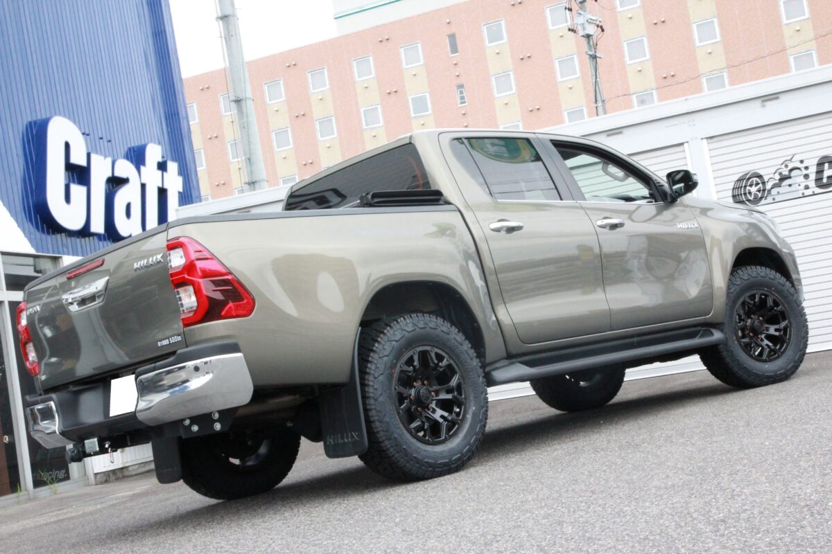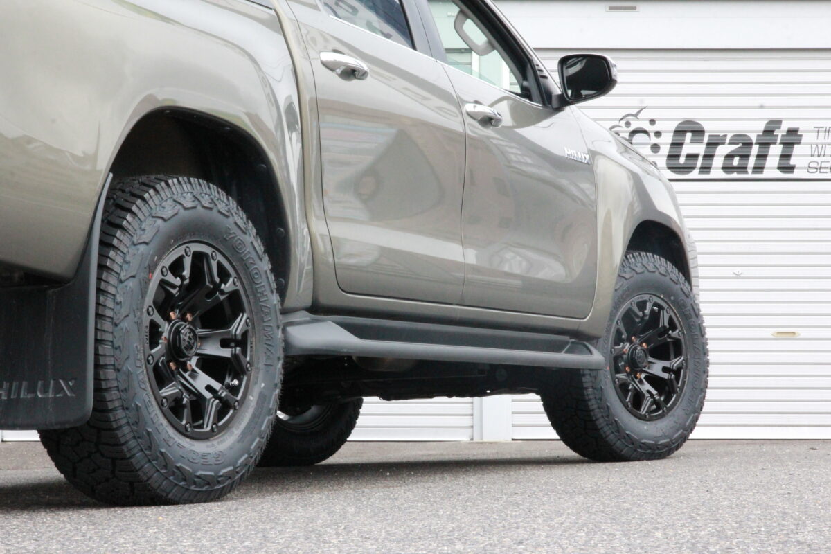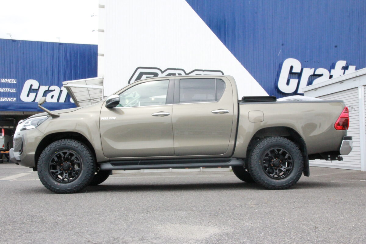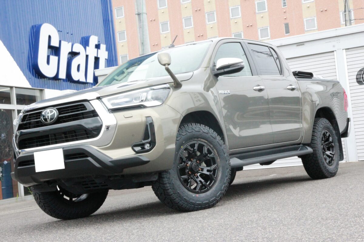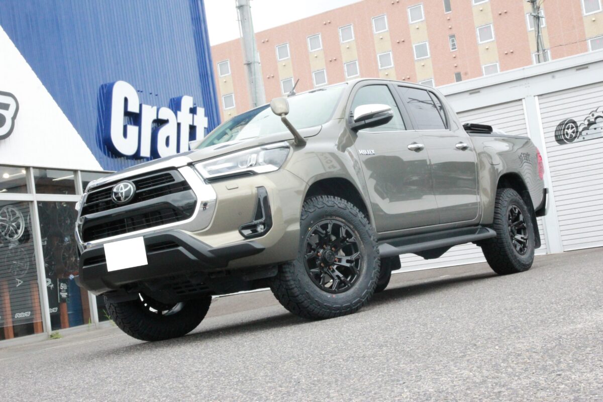 ハイラックスは 「 265/70R17 」 でも干渉するクルマ。。。 今回はJAOSマッドガードとの関係性も考慮しながら仕上げましたよぉ~✨     いつもありがとうございます、クラフト厚木店・佐藤です!!   本日のご紹介は、千葉県からお越しのT様・ハイラックスGRスポーツ。   ハイラックスと言えば、当店でもご相談が多く、今までにも多くの施工を行って参りました。   今回はその経験から得たノウハウで、オーナー様のご希望をしっかり叶える事が出来ましたよぉ~✨   それではコチラをどうぞ!!     T様からのご依頼は 「 タイヤ・ホイール交換 」 & 「 前下がりの補正(リフトアップ) 」 となります。   装着したリフトアップアイテムは 「 JAOS BATTLEZ リフトアップセット VFCA Ver.A 」 となり、車高の調整機能が備わっているモデルをチョイス。   今回オーナー様からいただいたご希望をクリアするには、この 車高調整式 と言う機能が必要だった訳です!!     上の画像はご入庫時のノーマル車高になります。   いたって普通のHILUX GR SPORTでしょうかね 👀👀   言ってしまえば、HILUX特有の前下がり感が見て取れます。。。   そして、ブレーキキャリパーとカラーを揃えたマットガードも装着しています。   今回はこの 「 マッドガードを装着している 」 と言う点に注意を払い、アイテム選びやセッティングを行いました🔧🔧     続いての画像は完成後のハイラックス。   見ての通り、車高が補正され、前下がり感もなくなっていますよねっ✨   前下がりの補正だけを考えた場合、同じくJAOSさんからリリースされているリフトアップコイルでもOK。   ですが、今回はタイヤサイズアップとそれに伴うマッドガードへの干渉も考え VFCA Ver.A を装着したんですよね。。。     まず、ハイラックスはタイヤサイズを大きくするとすぐに干渉問題が発生するおクルマ。   なので、どの位のリフトアップ量に仕上げるのかがとても重要!!   GRスポーツの場合、純正タイヤサイズが 265/60R18 となりますが、265/65R18 や 265/70R17 と言ったワンサイズアップ程度でも干渉問題がつきまとうんですよね。。。   しかも、ノーマル車高ではなく、リフトアップを行っていたとしてもです。汗     リフトアップを行っていないならともかく、リフトアップを行っているのに 「 ワンサイズアップ 」 も出来ないなんて、何だか残念ですよね。。。   ちなみに、干渉問題が発生するのは 「 フロント 」 のみとなり、更にはハンドルを切った時に限定されます。   そんなおクルマだからこそ、JAOSさんからインナーフェンダー加工KITが商品化されているんでしょうね 👀   それでは、HILUXはタイヤサイズを大きく出来ないのか??ってところですよね。   答えは 「 NO 」 です!!     当店でも 「 265/70R17 」 と言う定番サイズを筆頭に 「 275/70R17 」 や 「 285/70R17 」 などの2~3サイズアップまでのサイズはご要望も多く、多くの装着事例があります 👍   ですが、今回はJAOSマッドガードを装着しており、その部分の干渉を避けたいと言うご要望を加味しながらアイテムをチョイス!!   まずリフトアップアイテムに VFCA Ver.A をチョイスしたのは干渉を防ぐために 2.5インチ 程のリフトアップを行う必要があった為。   ちなみに、この仕様(リフトアップ量)の事を当店では 「 ちょいアゲ仕様 」 と呼んでいます。笑   ちょいアゲと言っても少し上がる訳ではなく、迫力の仕上がりとなりますよぉ~✨   そしてハンドルを切った際の干渉を抑える為に 「 265/70R17 」 と言うタイヤサイズをチョイス👍   この組み合わせにより、施工後もタイヤとマッドガードの干渉を抑える事も出来、オーナー様のご希望を叶える事に成功したと言う訳です。   そしてもう1つの拘りが出ヅラになります👀👀     上の画像のように、しっかりリフトアップを行った事で、タイヤサイズを大きくしながらもマッドガードへの干渉は回避。   そして最終ミッションはハイラックスGRスポーツのワイドフェンダーにマッチするホイールサイズの提案です!!   本日装着の RAYS DAYTONA D325 は見ての通り、オフ感漂うアイテム。   ですが、その良い雰囲気も出ヅラ次第では良さを引き出しきれないんですよね。。。   そんな訳でホイールサイズにも拘って仕上げた出ヅラがコチラ!!     前後ともに、キレイな出ヅラへと仕上がっていますよね!?   タイヤのサイドウォール部でギリギリの出ヅラ、これぞツライチと言った仕上がりっ 👍   特にHILUXは1ナンバー(普通貨物)の登録の為、プラドやランクル250などの普通乗用車とは基準が違います。   要は 「 タイヤ(ゴム部)の突出も許されない 」 クルマなんですよね。。。汗   そんな事から、今回のカスタムはリフトアップ量の計算や干渉を抑える為のタイヤサイズ、更には出ヅラと言った多くの計算が必要となるカスタム事案だった訳です。   そんなちょっと高度なミッションでしたが、当店で行ってきた多くの施工事例から得たノウハウで無事施工完了っ👍   これから愛