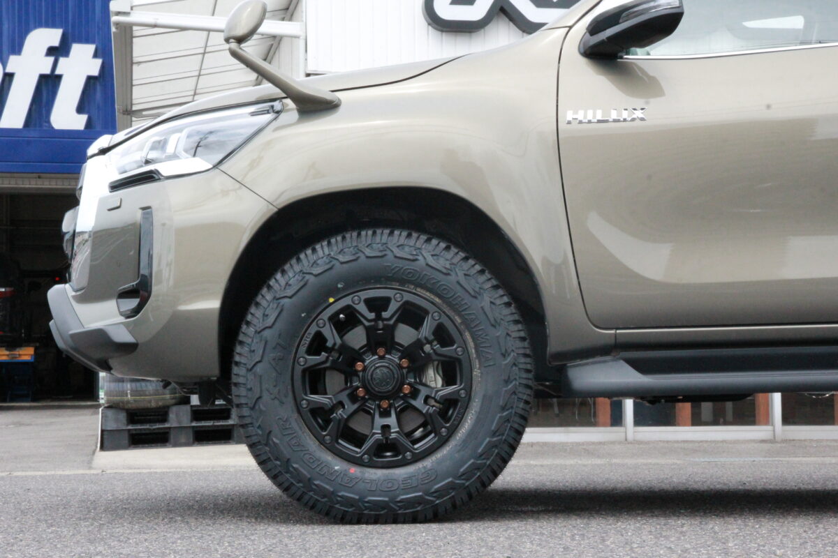 ステルスブロンズブラッシュドとジオランダー A/T4 の組み合わせ。 アウトラインホワイトレターがちょうど良い 👍     いつもありがとうございます、クラフト厚木店・佐藤です!!   本日のご紹介はM様・HILUX GRスポーツ。   TOYOTAのヨンク系って強いですね。。。   っと、言うのもココ数年、150プラドから始まり、HILUXやRAV4のカスタムを多く行っています!!   そしてココ最近ではランクル250やランクル70(GDJ76W)も増えてきており、ヨンク時代が到来しているのか??って思う程ヨンク系オーナー様からのご相談が増えています。   そんな訳で本日もHILUXのカスタムブログをお楽しみくださ~い♬♬     装着しているホイールは 「 4×4エンジニアリング Air/G ロックス 17インチ 」 となります!!   ハイラックスが装着するホイールはどのアイテムを選んでもコンケイブが効いたモデルが多いと思います。   その理由はインセットの設定にあります。     こうして見ても、なかなかのコンケイブスタイルですよね!?   Air/G ロックスには6つのFACEが設定されており、本日装着しているホイールはFACE5となっています。   ちなみに、コンケイブが強まるのは 1 → 2 → 3 と言った様に、数字が大きくなればなる程コンケイブが増す仕組み。   なので、FACE5と言うのは最大コンケイブの1つ手前と言う事。     ちなみに、HILUX GR はワイドフェンダー化されたおクルマ。   なので、インセット±0 (FACE7) 位の設定があったら更にカッコ良く仕上げられるんですけどね 👀   残念ながらそんな熱~いサイズ設定はありませんでした。。。笑     そんなAir/G ロックス に組み合せたタイヤは 「 ヨコハマタイヤ ジオランダー A/T 4 」   タイヤサイズは 265/70-17 となります!!   150プラドと違い、HILUXはタイヤを大きくするのが本当にムズカシイ車。     本日はタイヤ・ホイール交換と同時にフロントのリフトアップを行いました。   お気付きだとは思いますが、リフトアップをする理由は 「 タイヤ外径を大きくしたタイヤ 」 を装着する為!!   オーナー様がご希望されていたタイヤサイズは 265/70-17 となり、純正装着タイヤより1サイズ大きなサイズ。   ですが、HILUXの場合はそんな1サイズアップでも干渉問題が付きまとうんです。。。汗     本日のリフトアップアイテムは 「 JAOS リフトアップスプリング 」 となります。   車高調式(VFCA)の場合は大きくリフトアップ出来ますが、本日装着のリフトアップスプリングは1,5インチ程のリフトアップ量。   HILUXは車高をアゲればアゲるほど大きなタイヤを装着出来ます。   ちなみに、リフトアップ量が1,5インチ程の場合は 265/70-17 が限界でしょうね。。。   作業終了後に干渉の有無をチェックしましたが、問題なく無事に装着出来ていましたよぉ~ 👍   貴方の愛車はどんな仕上がりがご希望でしょうか?? ご相談お待ちしておりま~す♬♬     M様、この度はご利用誠にありがとうございました!!   前下がりスタイルがしっかり補正され、そして足元を支えるタイヤ・ホイールも迫力UP出来ましたねっ✨   カッコ良く仕上がった愛車は眺めているだけでも楽しいですよね。。。笑   もちろんカッコ良く仕上がった愛車でのドライブは格別、沢山お出掛けしてくださいねっ♬♬   それではまたのご利用よろしくお願いしま~す☆☆