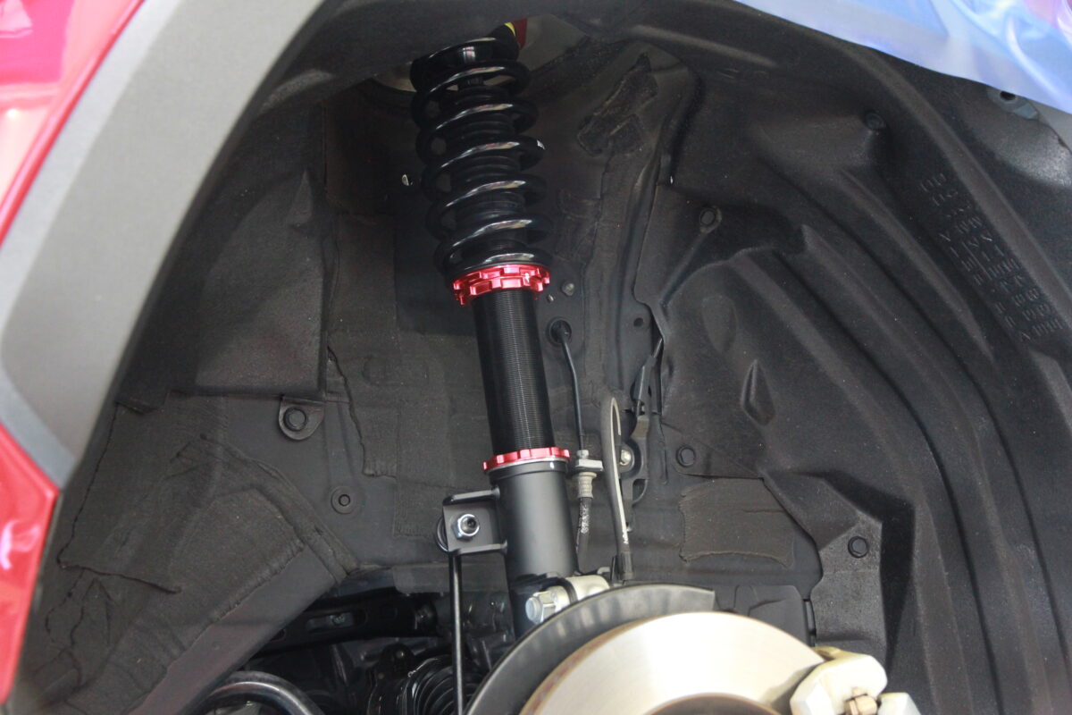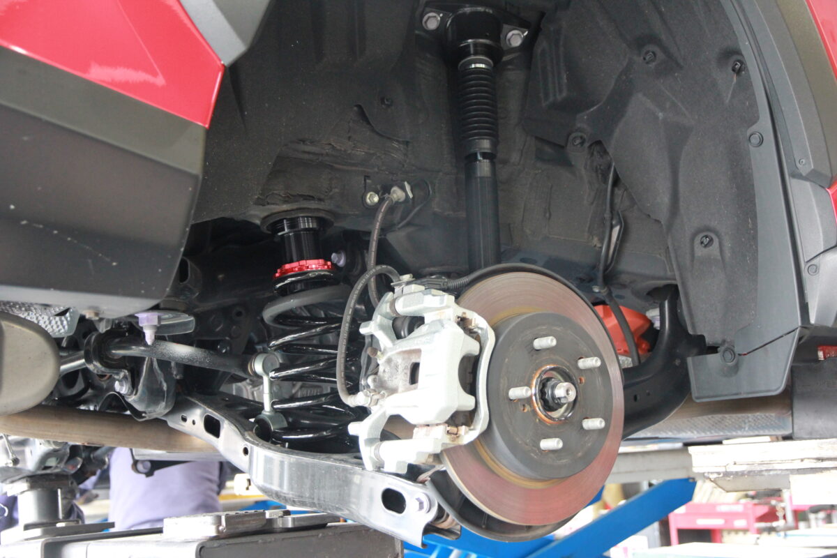 リフトアップした事でちらりと見えるブリッツの赤黒ショックが