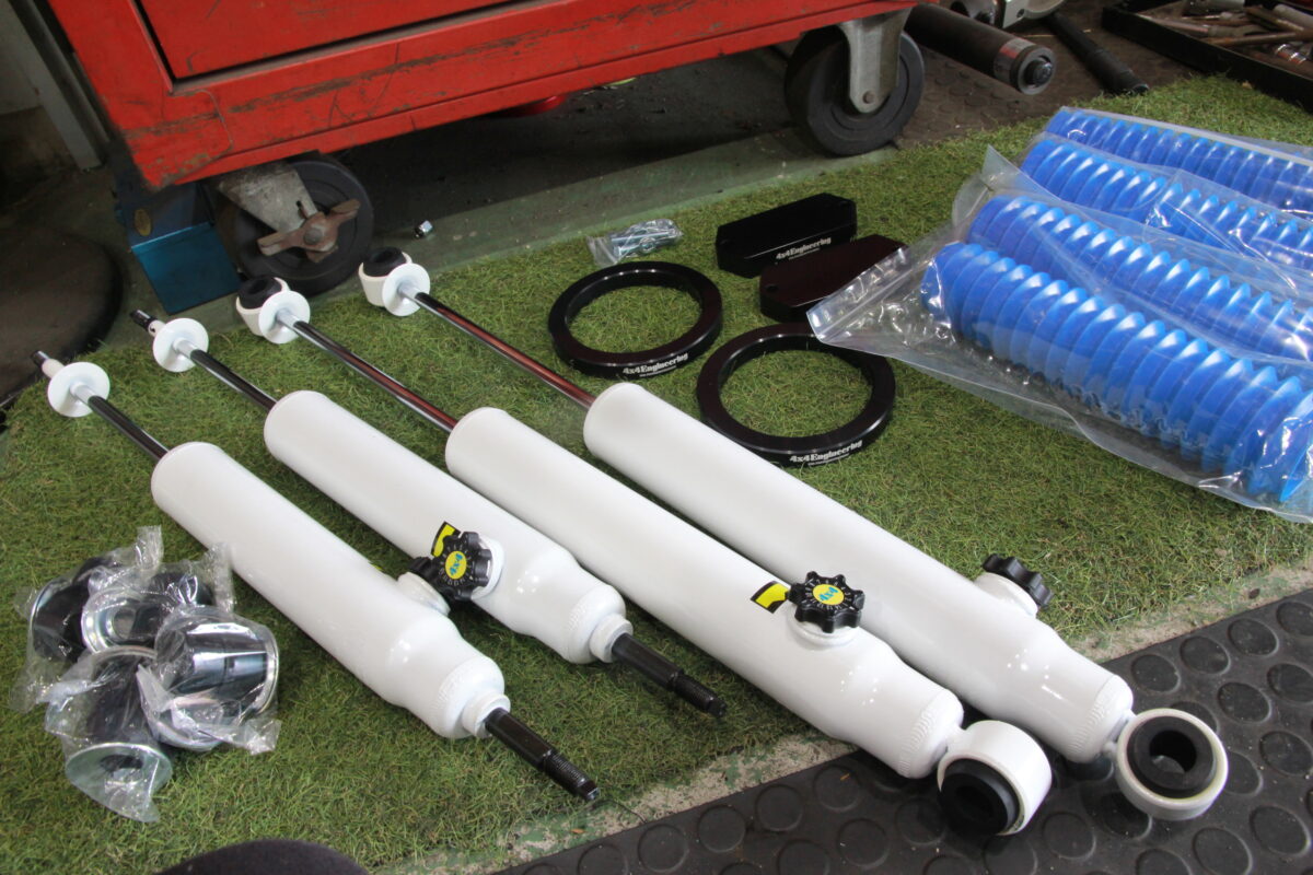 ホイールメーカーと同じく4×4エンジニアリングが手掛けるショックアブソーバー&フロントコイルスペーサーを装着します!!