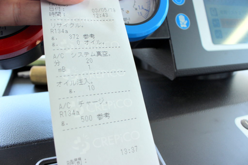 ガス量測定(全数抜き取り)→真空引き(漏れチェック)→コンプレッサーオイル補充・エアコンガスを規定値注入を行います。