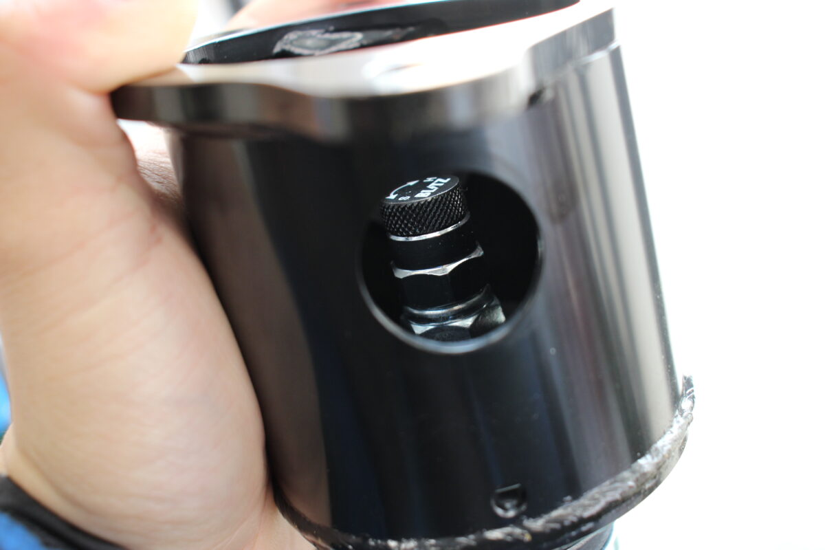 リヤショックの減衰ダイヤルは車内からではなくアッパーマウント側面の窓から調整するようになっています。
