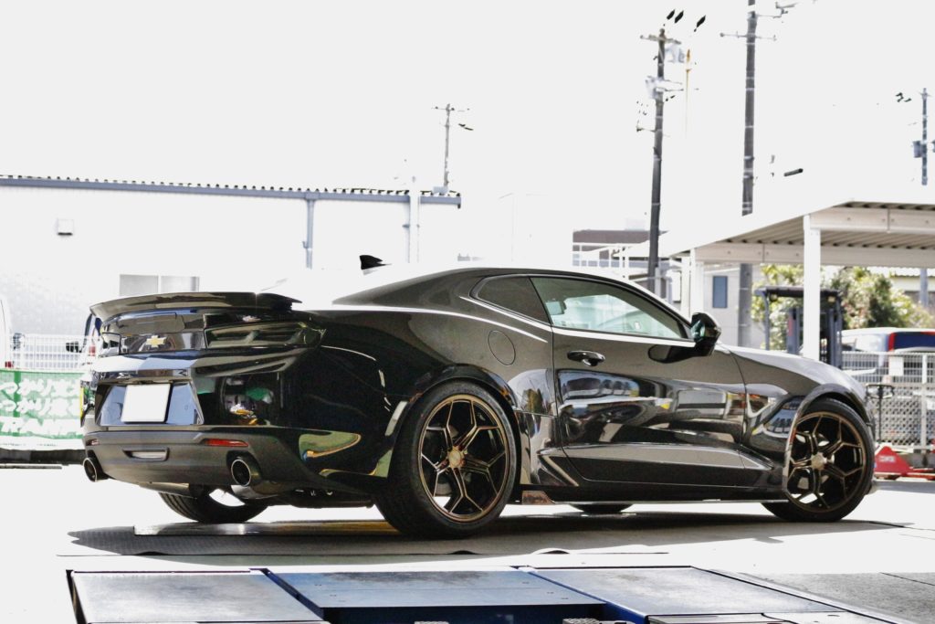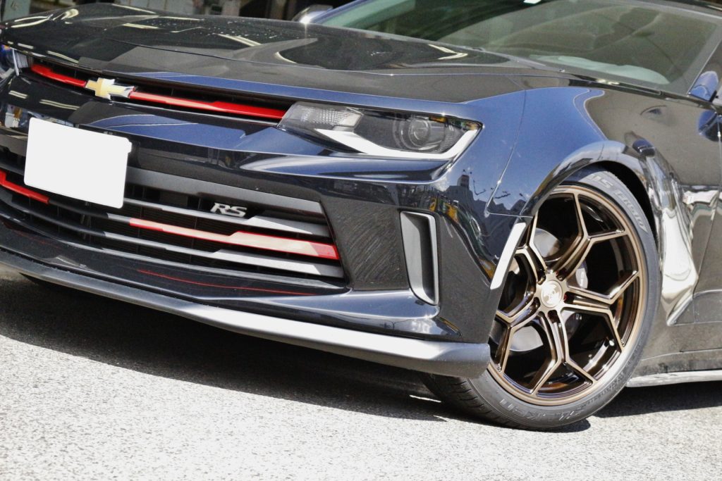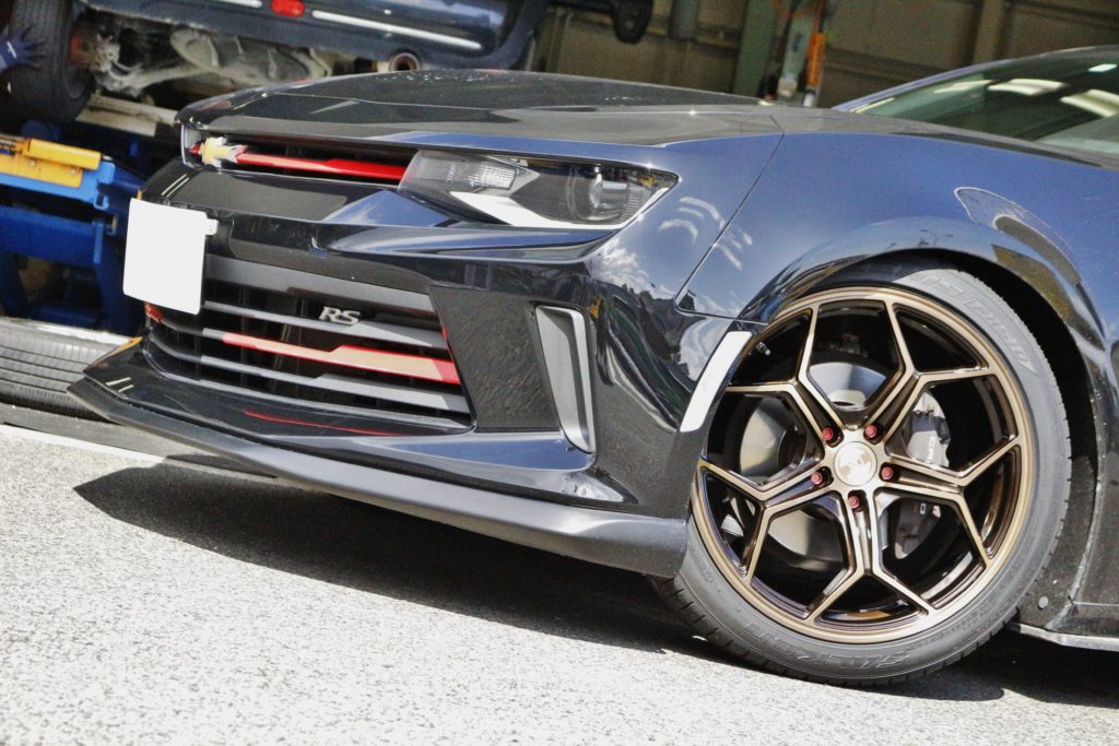 車高調でローフォルムに仕上がった シボレー カマロ に 大口径20インチ装着。