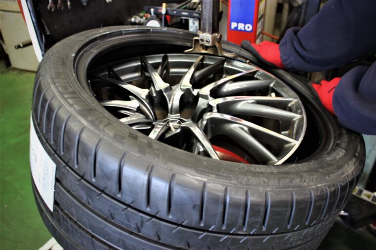 タイヤの組み込み作業中の画像、慎重にタイヤをホイールに組み込んで行きます。