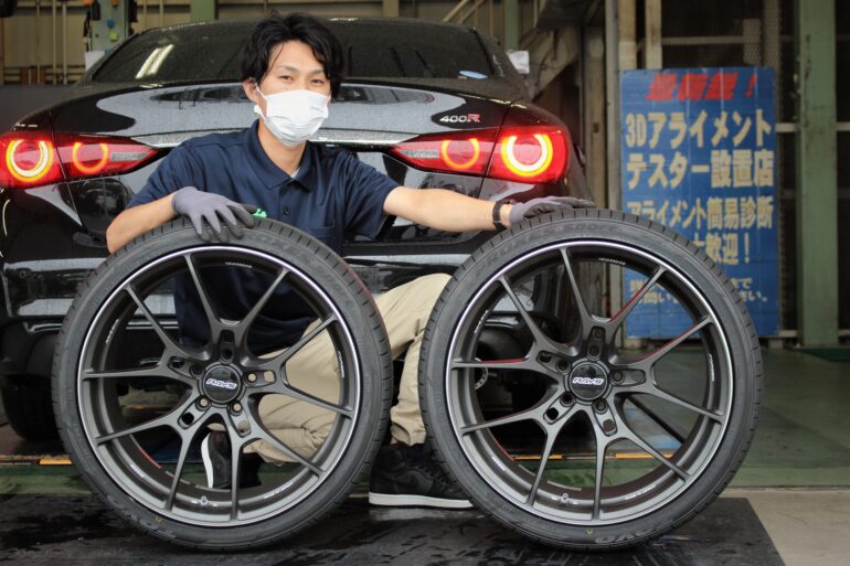 スポーツカーにお勧めホイール!!グラムライツ57CR SPEC-D!!   スポーツカーのご来店が多いクラフト一宮店です。 本日は400RにRAYSのスポーツホイールを 装着しましたのでそのご紹介です。     見た目はスカイラインですが V6、3リッターエンジンを積んだ まさに羊の皮を被った狼、それが400R。 今回はそのスペックに合わせた スポーツホイールを入れていきます。     そのホイールがこのグラムライツ57CR SPEC-Dです。 RAYSのスポーツホイールだと 37などの鍛造ホイールを思い浮かべる方も多いと思いますが 昨今のホイールの性能向上により 鋳造ホイールもかなり見直されており サーキット走行などでのタイムも 鋳造ホイール装着車が名を連ねています。     早速装着といきたいのですが ネックだったのがこのキャリパー。 立ちもあり中々アフターホイールを招いてくれません。 57CR SPECのサイズスペックで見てみると、 19インチだとチューナーサイズのみが装着可能となっていました。 そのサイズを実車測定により装着確認し、 オーダーをかけさせて頂きました。     何かと長期納期で話題となるRAYSホイールでしたが なんとこのサイズに限っては即納とのお返事で、 ご予定を見て最速で取付を行いました。 ちなみに気になるキャリパークリアランスはこんな感じ。 良い感じです。     完成がこちらです。 一気にスポーツカーらしい見た目となりました。 中身もガラッと変わっています。 まずバネ下重量が大幅にカットされ、 400R本来の性能をより発揮できるようになりました。     コンケイブしたディスクも軽量化は勿論、 高い剛性を持ち合わせていて ハイスペックな400Rの力をしっかりとタイヤへ伝えてくれます。     タイヤ空転回避のためのローレット加工も備わっているので まさに理想のホイールといっても過言ではありません。     400Rはエアセンサーも標準装備されていますが、 こちらは57CRに流用させて頂きました。 メーカー回答では基本NGとなっていますが 流用できる場合も多いので お悩みの方は一度クラフトまでご相談ください。     ちなみに今回装着した57CR SPEC-Dの DはドリフトのDです。 走り込む事を目的としたホイールとなっているので 気になった方は是非ともご相談ください。   RAYSは8月より値上げを発表されています。 7月中のご注文分については値上げはありませんので RAYSホイールを予定されている方は是非ともお早めに。     グラムライツはRAYSホイールのスポーツブランドでも 王道と言われるシリーズですが そんなピュアスポーツホイールの最先端がこのSPEC-Dです。 気持ちよく走りたい、車の性能を上げたいといった方は 是非ともお勧めなホイールです。     クラフト一宮店はレイズホイールNo.1ショップです。 RAYSホイールの展示量と在庫量は 常時地域最大級の品揃えとなっています。 気になっているRAYSホイールがある方は 是非一度クラフト一宮店までご相談ください。 それではまた次回のブログもお楽しみ。