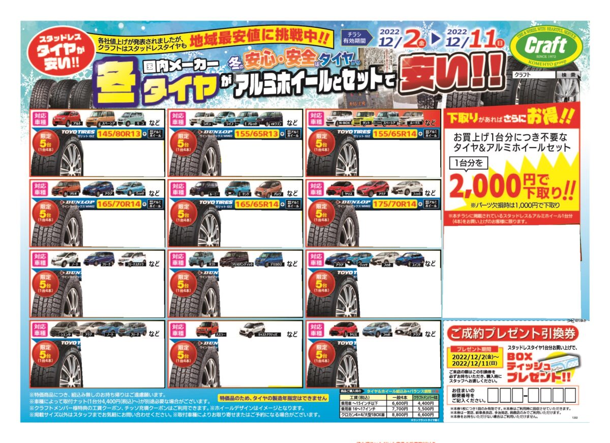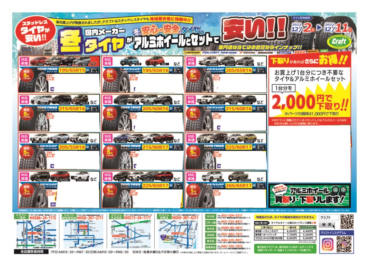続きを読むこんにちはクラフト相模原店です! クラフトでは2025年12月29日(月)までスタッドレスセールを開催中! 暑い夏が終わったばかりですが、もうすぐ冬がやってきます。 お持ちのスタッドレスタイヤの状態はいかがですか? ホイールもセットで新調する方、ご検討状況はいかがですか? クラフトでは早めの冬支度をオススメしております。 夏タイヤ同様、新品タイヤは慣らしが必要となります。 ハイシーズン時にしっかりとスタッドレスとしての性能を発揮するためにも早めに装着しましょう! また、早ければ早いほど商品の選択肢が豊富かつ待ち時間が少なめでご案内が可能です! 早めのお持ち帰りでお値引きの特典もございます。 10月31日(金)までのお持ち帰りで5,000円値引き。 11月1日(土)~11月30日(日)の期間のお持ち帰りで3,000円値引き。 12月1日(月)~12月29日(月)の期間のお持ち帰りで2,000円値引き。 早ければ早いほど値引き金額も大きくなっております! ※お持ち帰りいただいた商品を後日取付の場合は、別途取付工賃を頂戴いたします。 さらにご不要のタイヤ&アルミホイールセットがあれば高価下取りも行っております! 12月29日(月)までの期間は4,000円以上で下取りさせていただきます! もちろん4,000円以上の価値あるアルミホイールには、ご納得いただける適正価格をご提示いたします。 ※スチール(鉄)ホイールは対象外となります。 店頭の冬支度も着々と進んでおります。 リーズナブルな商品からこだわりの商品まで様々なホイールを展示中。 タイヤもダンロップ、ヨコハマ、ブリヂストン等各種お取り扱いしております! 早目の決断でお得に冬支度を済ませましょう! 皆様のご来店をお待ちしております! 相模原店イベント情報はこちら↓↓↓