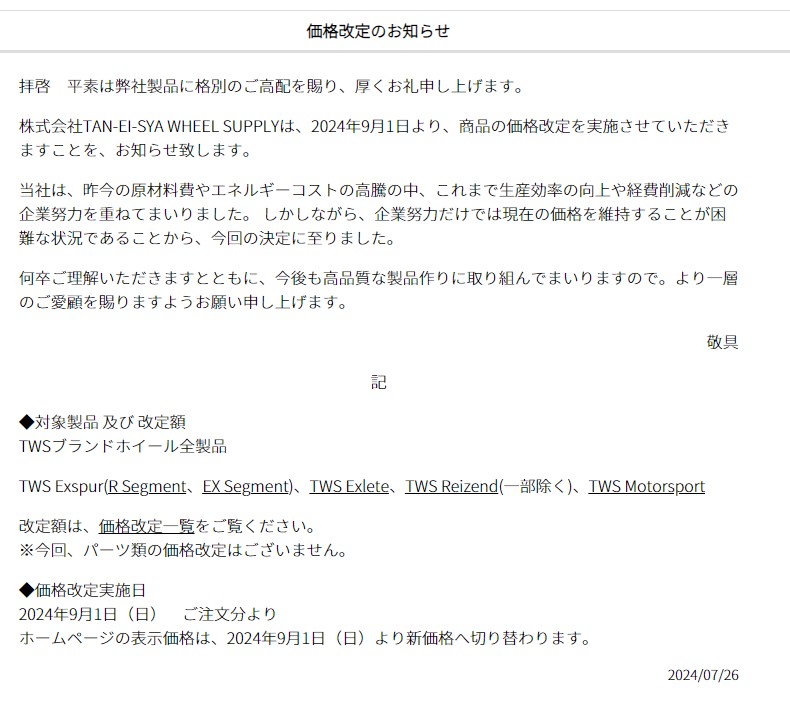 本日はホイールの値上げ情報が入りましたので