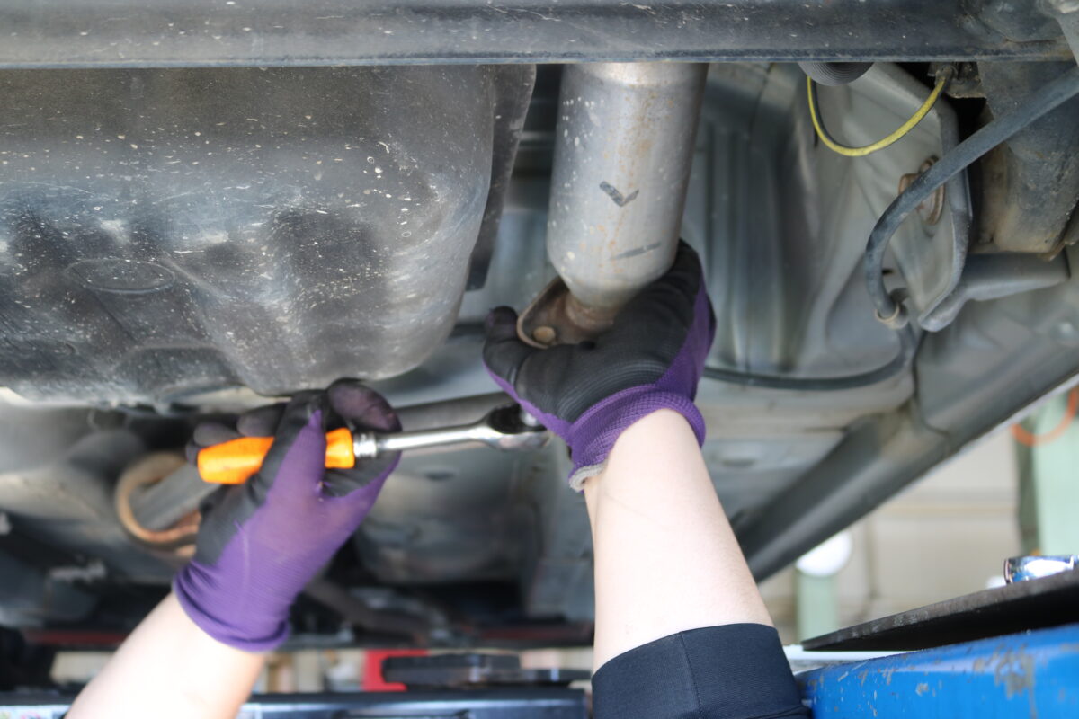 では純正マフラーを外していきます。