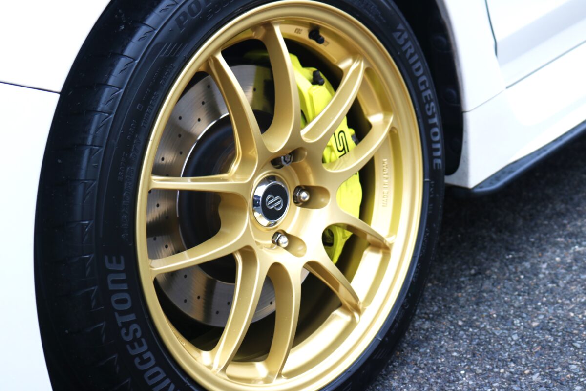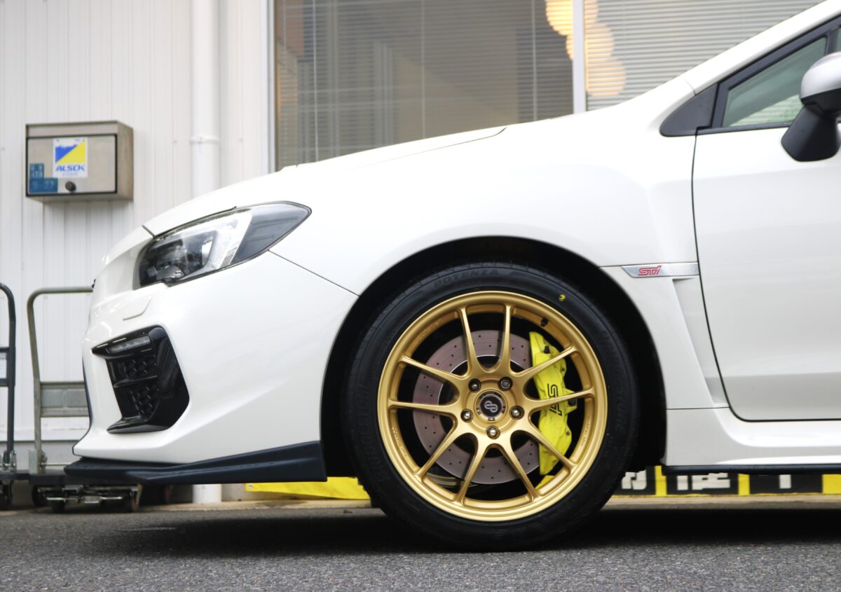 6POTブレーキ装着車のWRX STIにPF01のゴールドカラーを装着。