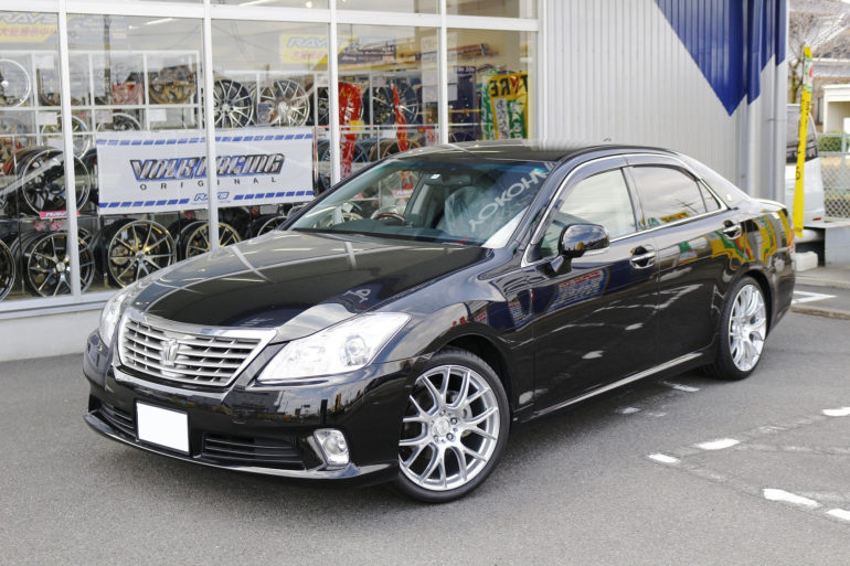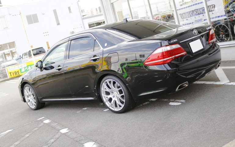 続きを読む車高調キットでローダウンを極めた クラウンロイヤルサルーンにさらに一手を。 エイムゲイン GTM 20インチで1mm単位で出ヅラに拘る。 拘りの一台に仕上げさせて頂きました。 クラフト知立店 金子です。 今回はトヨタ クラウンロイヤルサルーンのカスタムをご紹介。 既に車高調キットでローダウンは施工済み。 車高調キットを取付後、実車計測を行い 拘りの出ヅラ、愛車像へ仕上げさせて頂きました。 オーナー様、いつもクラフト知立店のご利用誠に有難う御座います!! ボディキットなども展開している【エイムゲイン】 セダン、SUVカスタムオーナー様ご用達のメーカーアイテム。 2×5スポークの【GTM】20インチをご用意させて頂きました。 エイムゲインのホイールはリバースリムにステップリム ダグリップリムやソリッドリム。 そしてディスクカラー、ピアスボルト 選択が豊富に御座います。 センターキャップの仕様などなど セレクトする事の多いホイールですが、 オーナー様のお好みに応じて製作する事が出来るのは カスタムする中では嬉しいポイントです。 溶接2ピースタイプのホイールの為 1mm単位でインセットをオーダーする事も可能です。 クラウンはローダウンしたらした分だけキャンバーが寝て来ます。 その為純正車高とは全く異なるサイズを手に入れる事が出来、 ご覧の通りリムの深さも強調出来ております♪ タイヤ:ニットー NT555 G2 ホイールサイズはフロント9.0J/リヤ9.5Jに対し タイヤサイズは235/30R20・245/30R20をセレクト。 過激な引っ張りにはならず、ショルダーは少し丸みを帯びます。 (before) (after) WHEEL:エイムゲイン GTM(クラウン純正センターキャップ仕様) SIZE:(Fr)9.0J-20インチ / (Rr)9.5J-20インチ TIRE:ニットー NT555 G2 SIZE:(Fr)235/30R20 / (Rr)245/30R20 オーナー様と1mm単位で出ヅラに拘り、 インセットオーダーさせて頂きましたので ご覧の通り、バチバチのツラ狙いでセッティング!! 攻めの姿勢を崩さないオーナー様だからこそ 手に入れる事が出来るスタイリングです♪ どこまで出ヅラを攻めるか。 実車計測で寸法出しを行った上で出ヅラの打ち合わせを行いますので、 どういった仕様で仕上げたいかはオーナー様次第なところ。 せっかくホイールを変更するのであれば オーナー様好みの仕様にしていきましょう♪ オーナー様、いつもクラフト知立店のご利用 誠に有難う御座いました!! またのご相談、いつでもお待ちしております♪ セダンカスタムもクラフトまでご相談を('◇')ゞ 管理番号:0082510231003
