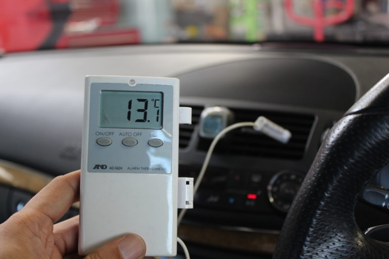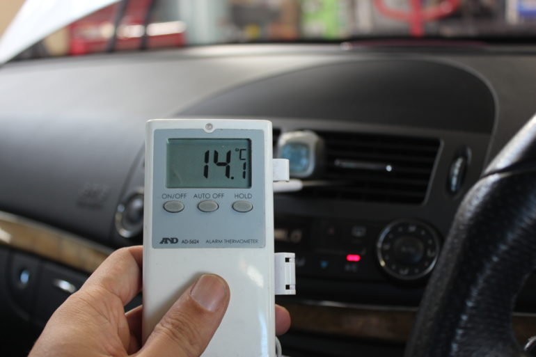 まずはエアコンガスの回収、クリーニング前の吹き出し口温度の測定結果は14.1℃。