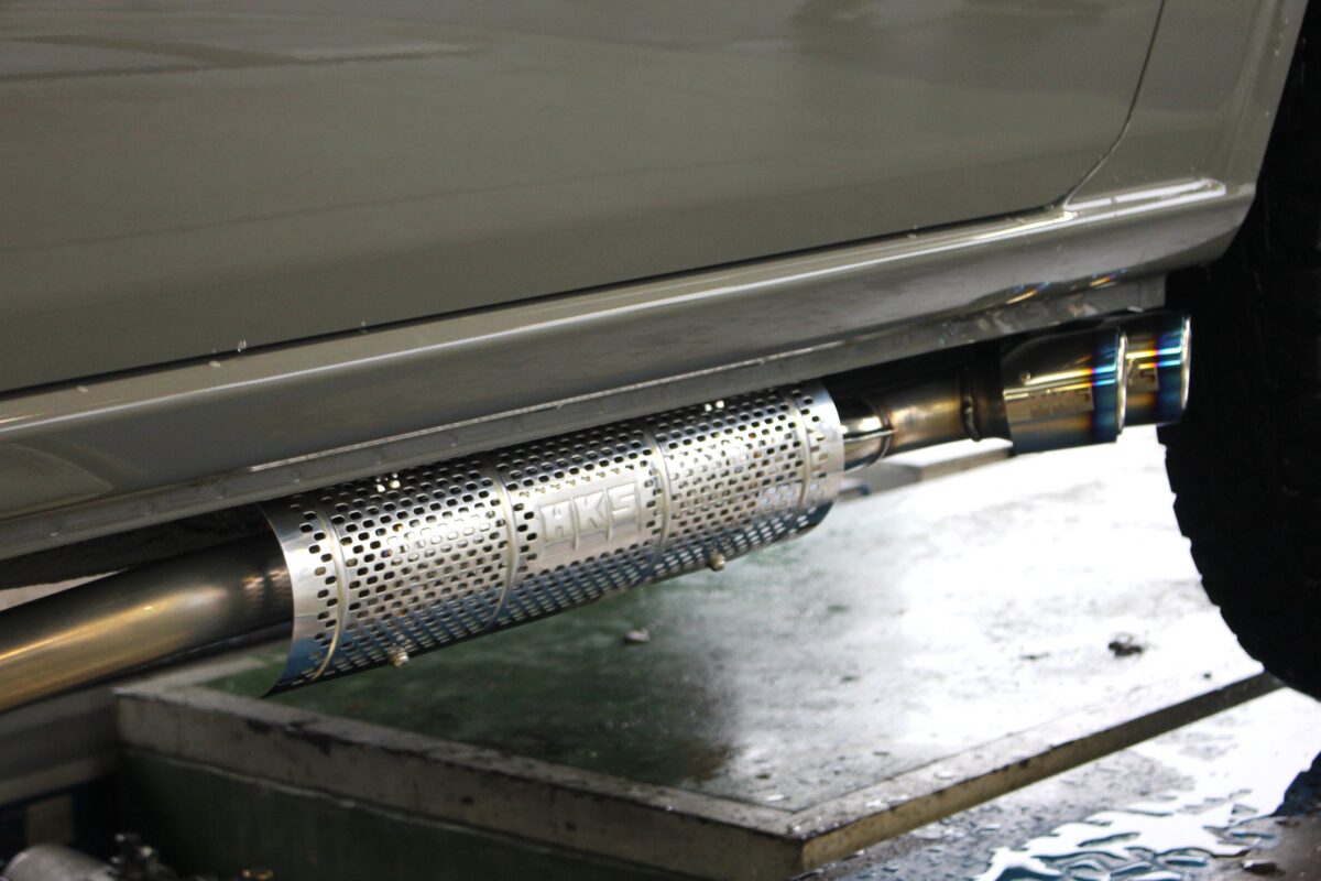ヨコからチラっと見えるサイレンサーにHKSロゴ入りのヒートインシュレーターがスタイリッシュさ演出。