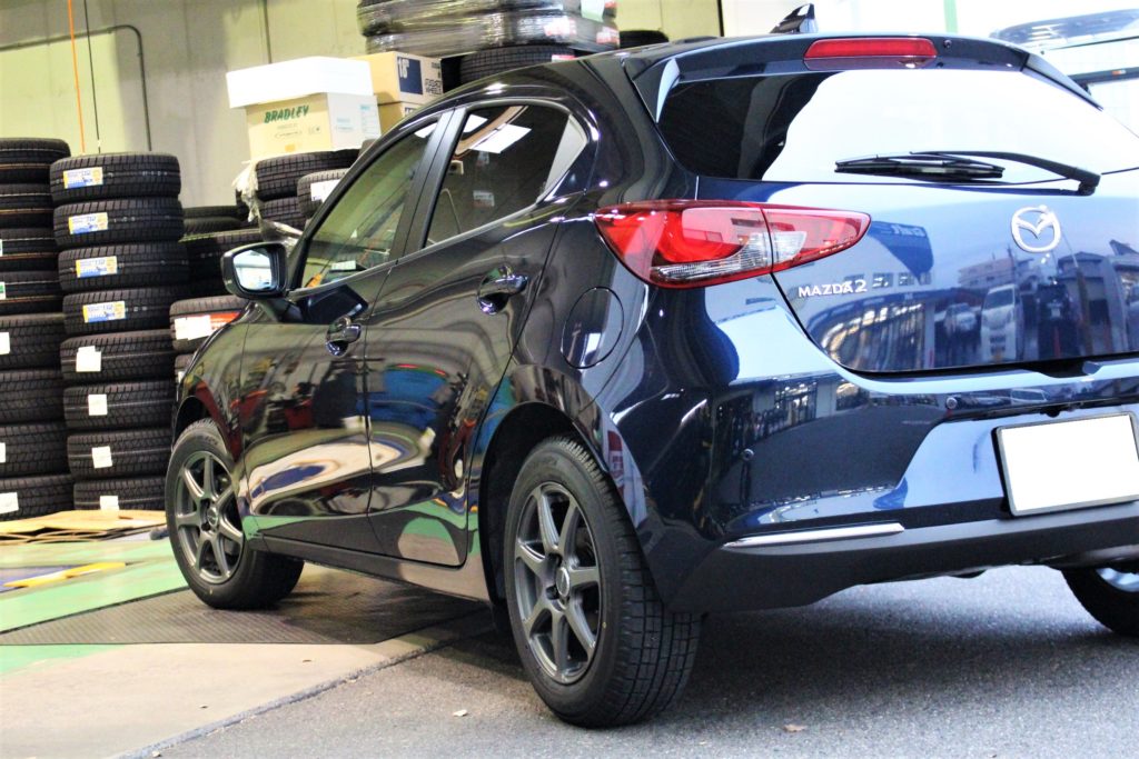 当店初入庫となるMAZDA2の足元に収まるのはWORKエモーションT7R。