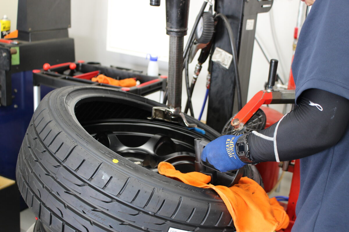 タイヤとホイールの重量差を調整しハンドルブレを防ぐ作業です。