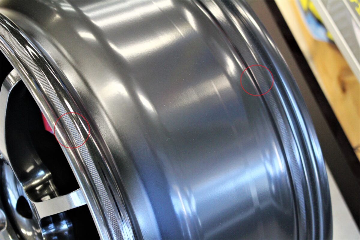 強力なパワー入力時にタイヤとホイールが空転しないようビード部にアンチスリップ加工(赤丸部)が施工済み。