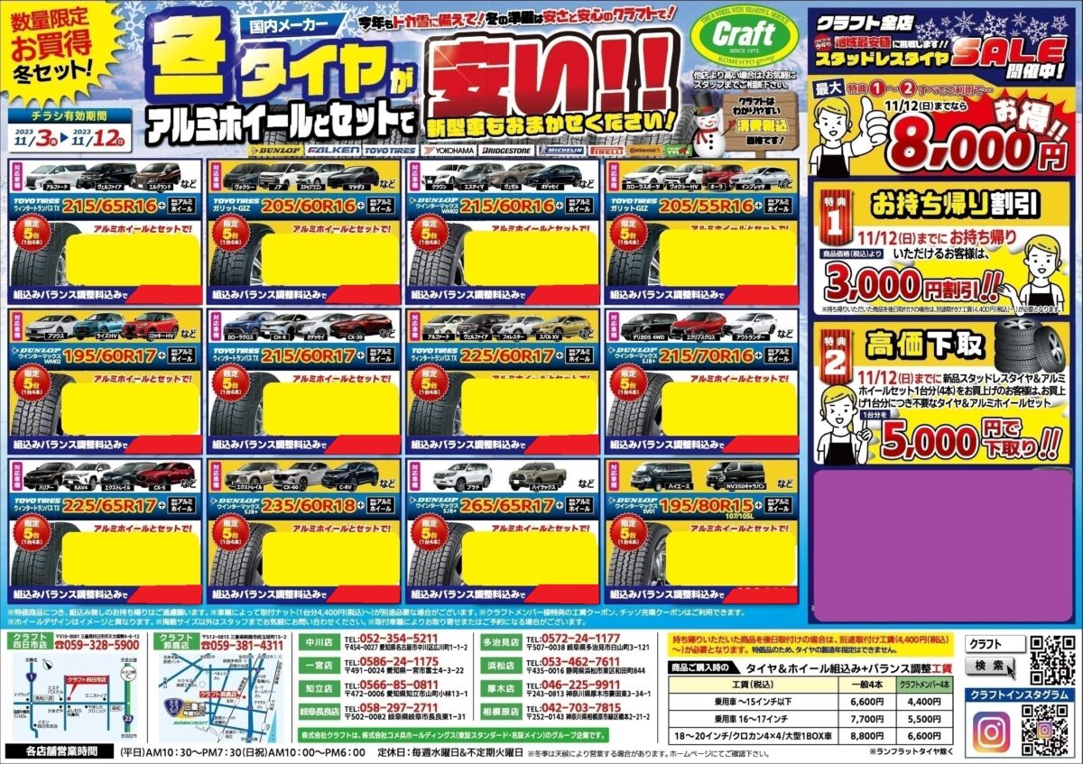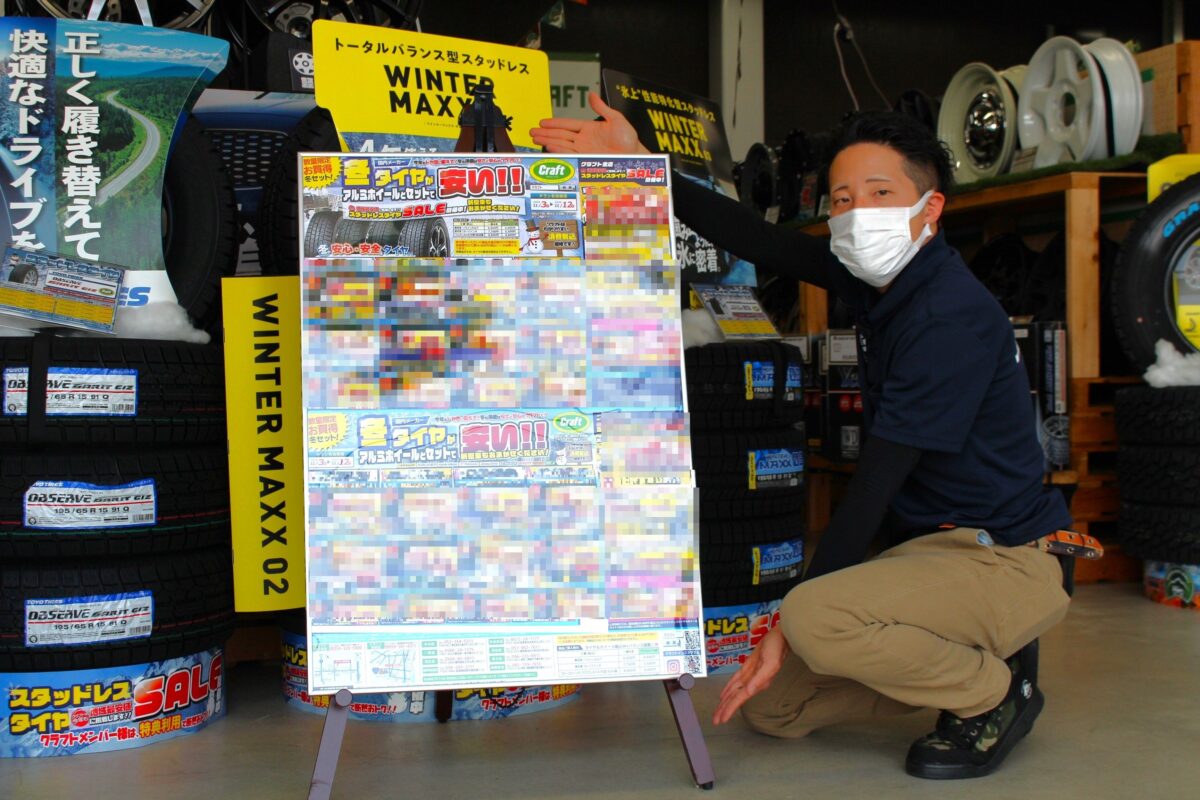 こんにちはクラフト相模原店です! クラフトでは2025年12月29日(月)までスタッドレスセールを開催中! 暑い夏が終わったばかりですが、もうすぐ冬がやってきます。 お持ちのスタッドレスタイヤの状態はいかがですか? ホイールもセットで新調する方、ご検討状況はいかがですか?   クラフトでは早めの冬支度をオススメしております。 夏タイヤ同様、新品タイヤは慣らしが必要となります。 ハイシーズン時にしっかりとスタッドレスとしての性能を発揮するためにも早めに装着しましょう! また、早ければ早いほど商品の選択肢が豊富かつ待ち時間が少なめでご案内が可能です!   早めのお持ち帰りでお値引きの特典もございます。 10月31日(金)までのお持ち帰りで5,000円値引き。 11月1日(土)~11月30日(日)の期間のお持ち帰りで3,000円値引き。 12月1日(月)~12月29日(月)の期間のお持ち帰りで2,000円値引き。 早ければ早いほど値引き金額も大きくなっております!   ※お持ち帰りいただいた商品を後日取付の場合は、別途取付工賃を頂戴いたします。   さらにご不要のタイヤ&アルミホイールセットがあれば高価下取りも行っております! 12月29日(月)までの期間は4,000円以上で下取りさせていただきます! もちろん4,000円以上の価値あるアルミホイールには、ご納得いただける適正価格をご提示いたします。   ※スチール(鉄)ホイールは対象外となります。   店頭の冬支度も着々と進んでおります。 リーズナブルな商品からこだわりの商品まで様々なホイールを展示中。 タイヤもダンロップ、ヨコハマ、ブリヂストン等各種お取り扱いしております!   早目の決断でお得に冬支度を済ませましょう! 皆様のご来店をお待ちしております!   相模原店イベント情報はこちら↓↓↓