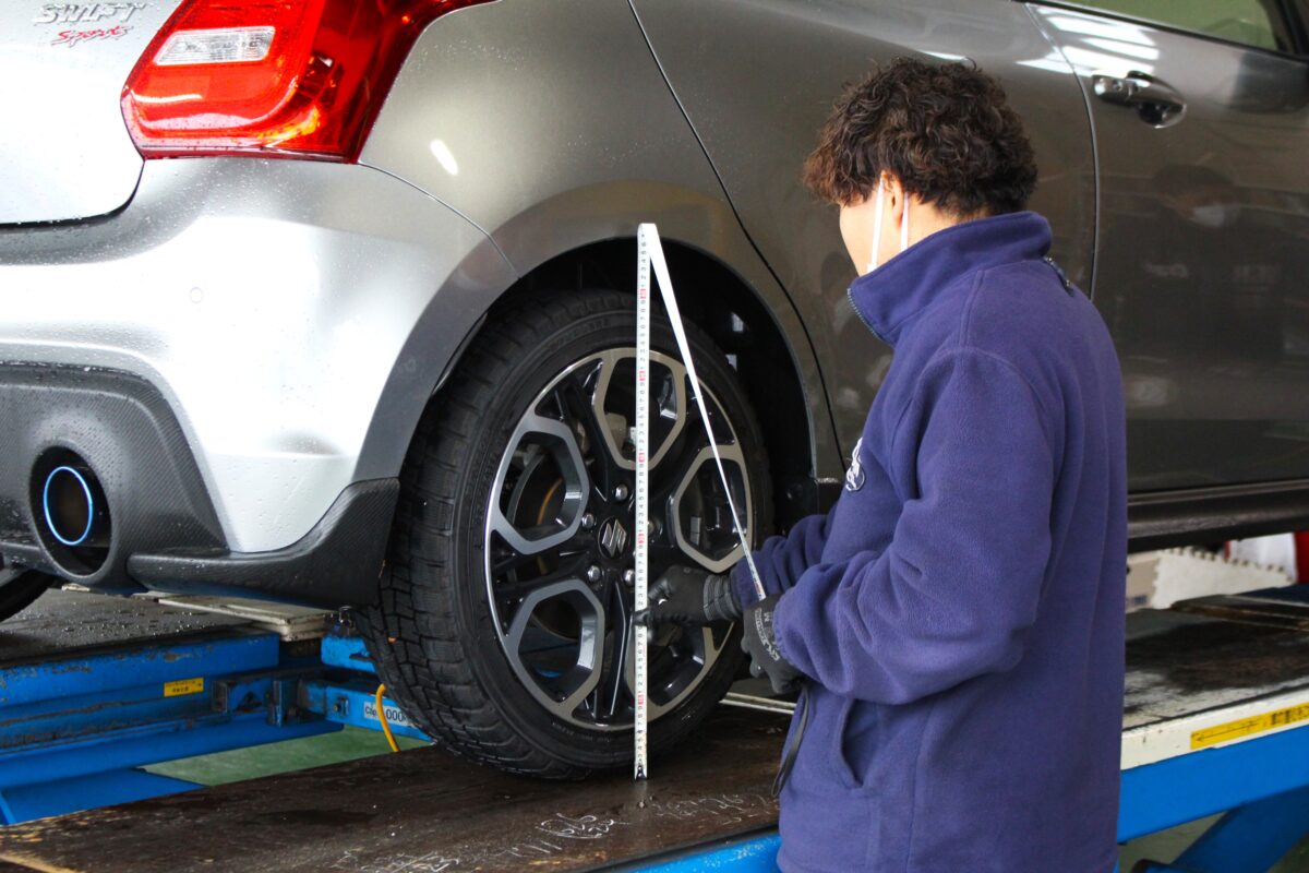まずは装着前の車高を測定。装着前後のダウン量をしっかり記録します。