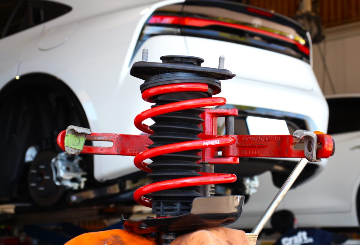 純正車高時の腰高感を解消すると共に装着予定のホイールを収めることを目指し取り付けます。