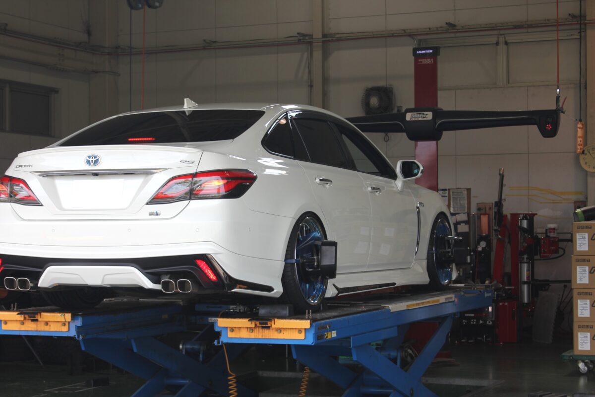 一番カッコよく見せたい車高へエアサスをセット後、アライメント調整を実施!