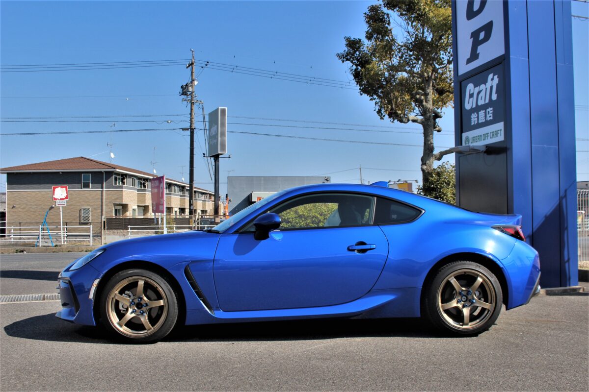 GR86に気合の太履き9.5Jを装着。   皆さんこんにちはクラフト厚木店のりかずです。   いつもブログをご覧いただき誠にありがとうございます。   今回ご紹介するお車はトヨタGR86。交換するアイテムはタイヤ・ホイール・車高調になります。   まず、ホイールなどを交換するにあたって「このデザイン、サイズ、コンケイブしているホイールがいい」など、ある程度希望があると思いますが、今回のお客様はコンケイブを重視してホイール選んでいきました!!   選ばれたホイールはアドバンレーシングのRG-4 18×9.5J!!   アドバンRG-4にはスタンダードデザイン・GTRデザイン・スーパーGTRデザインと3種類のコンケイブデザインがあり、スタンダード → GTR → スーパーGTR の順にセンターの落ち込みが深いです!   9.5Jを選択することによって1番コンケイブが深い「スーパーGTRデザイン」が履けるようになるのです!!   このサイズを履きこなすには車高調でローダウンが必須!!   なので、一緒にブリッツの車高調でローダウンを行いましたよ!   では、早速気になるイメチェンをご覧いただきましょう!   ~before~   ~after~   いかがですかね~~   フルノーマルから一気にここまで仕上げるとイメージがガラッと変わりますね!   このローフォルムが最高にかっこいい!!   スマホの待ち受けにしたいぐらいです。。。(笑)   ノーマルの時だとフェンダーとタイヤの隙間はこんな感じ。↑   ローダウンした後だとこんな感じ。↓   かなり隙間が埋まっていてスポーツカーらしくなっていますね~   もちろん最低地上高9cmは確保されていますよ👍   今回のお車にはブレンボのキャリパーが付いており、メーカーマッチングもOK!     マッチングOKと言われてはいたものの、ブレーキとのクリアランスはかなりギリギリ。。。   2、3mm前後ぐらいでしょうかね?   ギリギリを攻めたい人はいかがでしょうか?(笑)     コンケイブが深いホイール・太いホイールを履きたい人はいかがでしょうか!   一緒にローダウンもしてかっこよくしてみませんか😊   今回のGR86と同じ仕様にしたい、近い仕様にしたいなどご相談お待ちしております!     N様、愛車のカスタムを任せていただきありがとうございました!!   愛車の仕様に満足いただけましたでしょうか??   次のカスタムもお任せくださいね!!👍   またのご利用お待ちしておりまーす!!