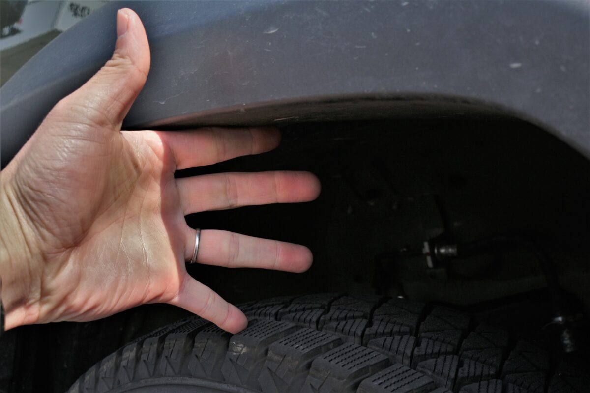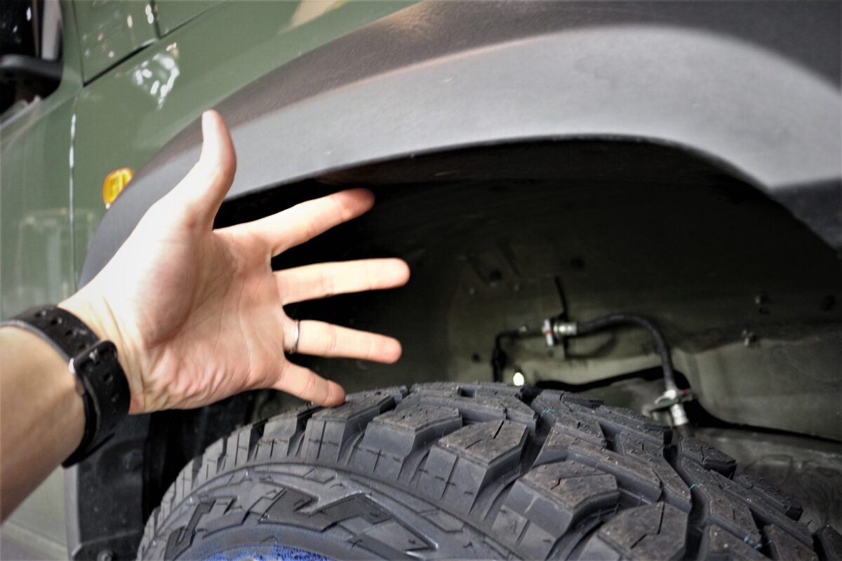 突出していないから保安基準もクリア。。。 そしてフロントバンパー小加工で干渉対策もOKですよぉ~ 👍     いつもありがとうございます、クラフト厚木店・佐藤です!!   本日のご紹介はS様・ジムニーノマド。   納車ラッシュ?? となっているのか、ここ最近ジムニーノマドでのご相談が増えている当店。   そんなノマドをホワイトレタータイヤを使ってカッコ良く仕上げましたよぉ~✨     ご購入いただいたホイールは 「 RAYS A・LAP-J 」 16インチ。   コチラのホイールはRAYSさん得意の ” 軽量鍛造 ” ホイール!!   おそらくジムニーシエラ・ノマド用のホイールでは最軽量??だと思われる、めっちゃ軽いホイールとなりますっ✨   そして、シエラやノマドオーナー様から良く聞くのが 「 走った感じがちょっと重たい 」 と言うお悩み。。。   軽自動車のジムニーとはエンジンも違い、排気量は 1500cc となっている K15B エンジン。   この車格で言えば 1500cc と言うのは妥当な気もしますが、皆様が感じている 重たい感じ はどこからきているのでしょうか!?     まず1つ考えられるのはアクセル開度を調整するスロットルにあるかと思います。   今までのジムニーやシエラ・ノマドはアクセル開度の調整(スロットル)が ” ワイヤー式 ” となっていました。   ですが、現行のジムニーやジムニーシエラ・ノマドはアクセル開度を電子制御する 「 電子スロットル 」 に変更されています。   ワイヤー式の場合はアクセルを踏んだ分がダイレクトに反映されていましたが、電子スロットルの場合 「 アクセルの踏み込み量=アクセル開度 」 ではなくなっているんですよね。。。   それにより ” アクセルを踏み込んでいるのに思っている加速をしてくれない ” っと言う感覚になってしまい、その感覚のズレが走りが重たく感じると言う症状につながってしまうのだと思います。   そうした背景には燃費性能の向上を図るなどの理由があったのではないかと思いますが、そんなクルマの特性を物理的に改善するのに効果的なのが 「 軽いホイールを履く事 」 なんですよねっ 👍   例えばボク達人間に例えると。。。 重たい荷物を背負って歩くのと手ぶらで歩くのとでは疲労感が違いますよね??   クルマでもそれは同じ事で、クルマ自体が軽くなれば走りも少し軽快になると言う訳です!!   そう言った意味では RAYS A・LAP-J はRAYSさんが得意とする 「 鍛造ホイール 」 となり、かなりの軽量ホイール。   間違いなく走りに違いが出る事でしょう 👍     なんだかうんちくが長くなってしまいましたが。。。   S様・ジムニーノマドはタイヤも少し太めのタイヤを装着したんですよぉ~✨   本日装着しているタイヤは 「 トーヨータイヤ オープンカントリーRT 」 となり、タイヤサイズは 225/70-16 となります!!     ですが、ノーマル車高のジムニーノマドには決して推奨サイズとは言えないタイヤサイズでもあるんです。。。   その理由はタイヤとボディーが干渉してしまうからです。   ちなみに、本日ご紹介のS様・ジムニーノマドもノーマル車高となります。   それでは次の画像をチェックしてみましょう!!     赤い丸で囲ってある部分ですが、現状では干渉はしていません。   ですが、この状態からハンドルをいっぱいに切り込んでいくと。。。 👀     このようにバンパー下部とタイヤが干渉してしまうんですよね。。。汗   撮影は静止状態で行っていますが、この状況で走行すると凹凸のあるタイヤとバンパー下部がこすれ合うので、なかなか刺激的な音が発生しそうですよね。   ですが、この干渉部位に少し手を加えてあげる事でクリアランスを確保する事も出来るんです!!     いかがでしょう、さっきまでバンパー下部と干渉していたタイヤですが、クリアランスが確保出来ていますよね!? 👀   もともと干渉している部分は軽微な干渉でしたので、この状態なら普通に乗れそうですよね。   ですが、オフロード走行をすると考えた場合はリフトアップや更なる対策が必要となるでしょう。   本日装着のタイヤサイズ&干渉対策は 「 ドレスアップを目的としたカスタムの場合 」 と考えていただければ良いかと思います ✋     そして干渉問題とは別に、もう1つ気にしてあげないといけないポイントがあるんですよね。   それはボディーからの突出問題です!!   ジムニーシエラやノマド用ホイールのインセットですが 「 -5 」 と言うサイズが多いのではないかと思います。   ですが、このインセットの場合 225/70-16 を装着するとタイヤ側面がボディーから突出してしまう可能性があるんです。   今までのデータでは ” 215/70-16 ” と言うジムニーシエラ・ノマドの定番サイズでも若干の突出が発生する事もあったんですよね。   しかしながら、現状の保安基準では 「 タイヤなら片側9mmまでの突出はOK 」 とされています。   そう言った意味では -5 のインセットのホイールを装着する場合は 215/70-16 までのサイズであればが安心して装着出
