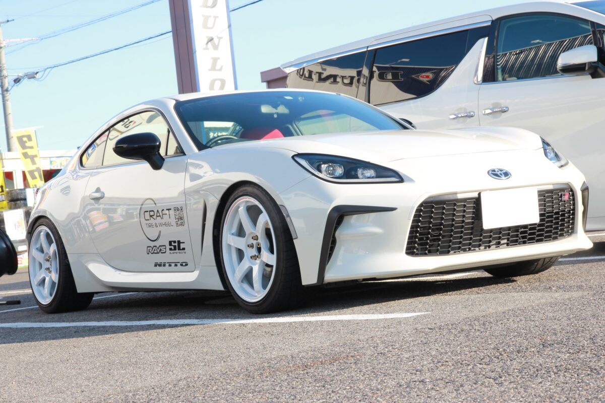 ■GR86×ブリッツ ZZR×AME トレーサーGT-V   いつもありがとうございます!!クラフト厚木店・のりかずです!!   本日ご紹介するのはK様・GR86。   ローダウンからタイヤ・ホイールのドレスアップまでを施工していきますよ!!     GR86をカスタムするにあたってよく質問を頂くのが、「8.5J」は車検が通るのかどうか問題。   この悩みはGR86を所有しているオーナー様なら一度は気になってしまう所ではないでしょうか。   実際、「8.5J」を装着すると出ヅラにゆとりが作れずにパツパツに仕上がってしまう事もあります。   当店も何台もののGR86を施工しましたが、パツパツな仕上がりになりやすかったのが、車高の下げ幅が少ない+スポークの突出量が多い組み合わせです。   車高を下げることによって、見た目がスタイリッシュ仕上がるだけではなく、キャンバー角の変化も現れます!     そして車高をしっかり下げる事によって、キャンバー角が寝る方向に増え出ヅラにゆとりが更に出てくるんですよね!   今回のGR86もしっかり車高を下げキャンバー角を増やしているんですよ!!   車高をしっかり下げるのに最適なアイテムなのが”車高調”となります!   今回セッティングしたダウン量は約30mm前後。   純正と見比べても一目瞭然ですよね👍   ■before   ■after   このぐらいの車高でも最低地上高は保たれており、キャンバー角も増えるので、オススメです👍   見た目もスタイリッシュに仕上がり、スポーツカーらしさが手に入りますよ✨     そして今回取り付けたホイールは”AME トレーサーGT-V”   ホイールサイズは人気な「8.5J-18インチ」。   スポーク突出量が少なく、かなり軽量となっているモデル!!   ホームページ上でも記載がありますが、重量がなんと7.9㎏と鍛造ホイールにも匹敵するぐらい軽量となっています!!     そして出ヅラもちょうどよく仕上がってくれていますよね!!   この仕様でフェンダーから糸を垂らしても、タイヤ・ホイールに触れていませんでしたよっ!   では、最後にまとめ!!   「8.5J」をうまく収める方法は「車高をしっかり下げる」・「スポークの突出量が少ないものを選ぶ」といい感じに仕上がりますよ!!   それでは沢山のご相談お待ちしております!!   ■before   ■after   K様この度はクラフトをご利用いただきありがとうございました!!   車高をしっかりさげたことによっていい感じの出ヅラに仕上がりましたね!!   そしてワンポイントで貼ったステッカーもいい感じです👍   かっこよく仕上がった愛車を楽しんでくださいね~   それではまたのご利用お待ちしております!!   管理番号:0412512231010